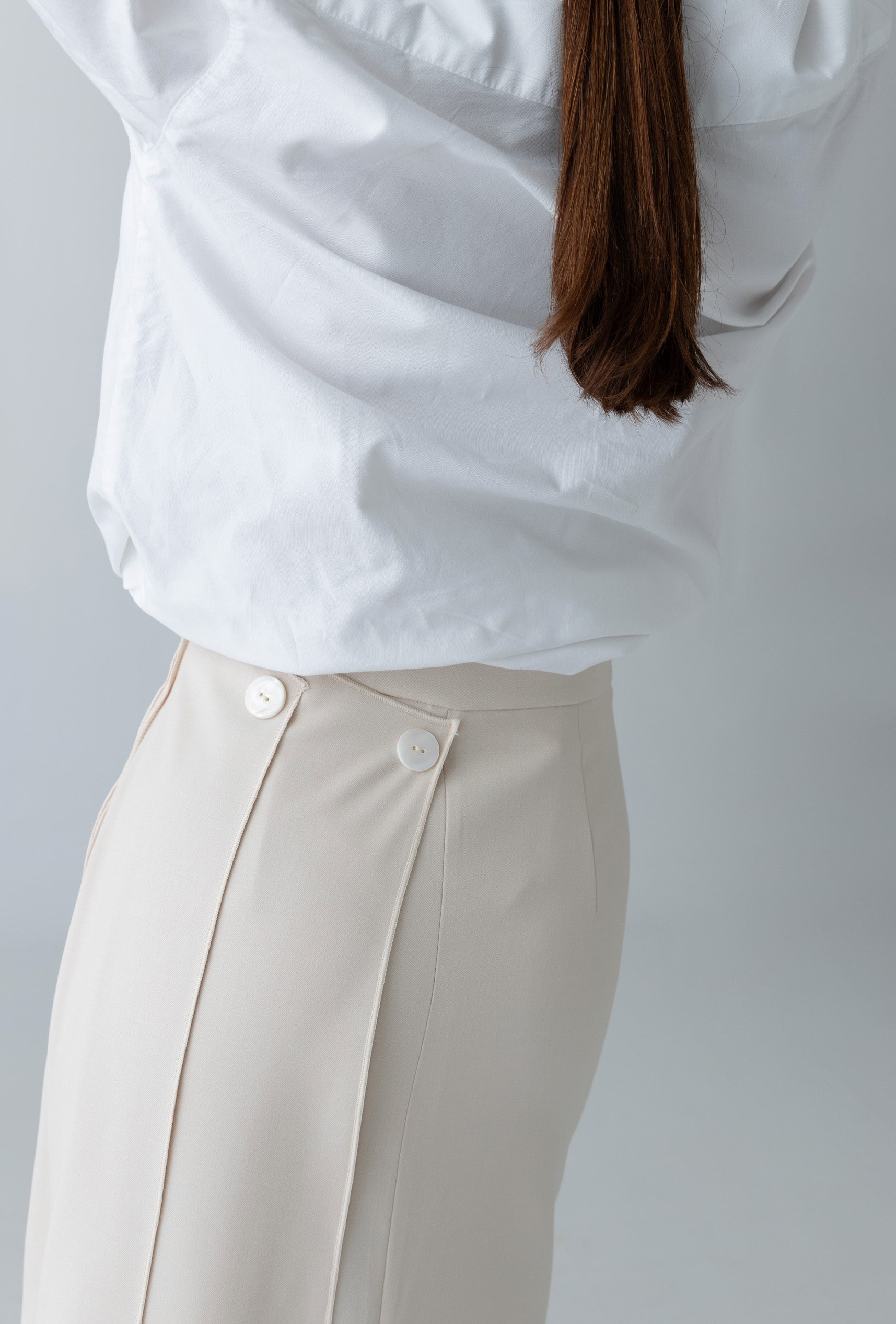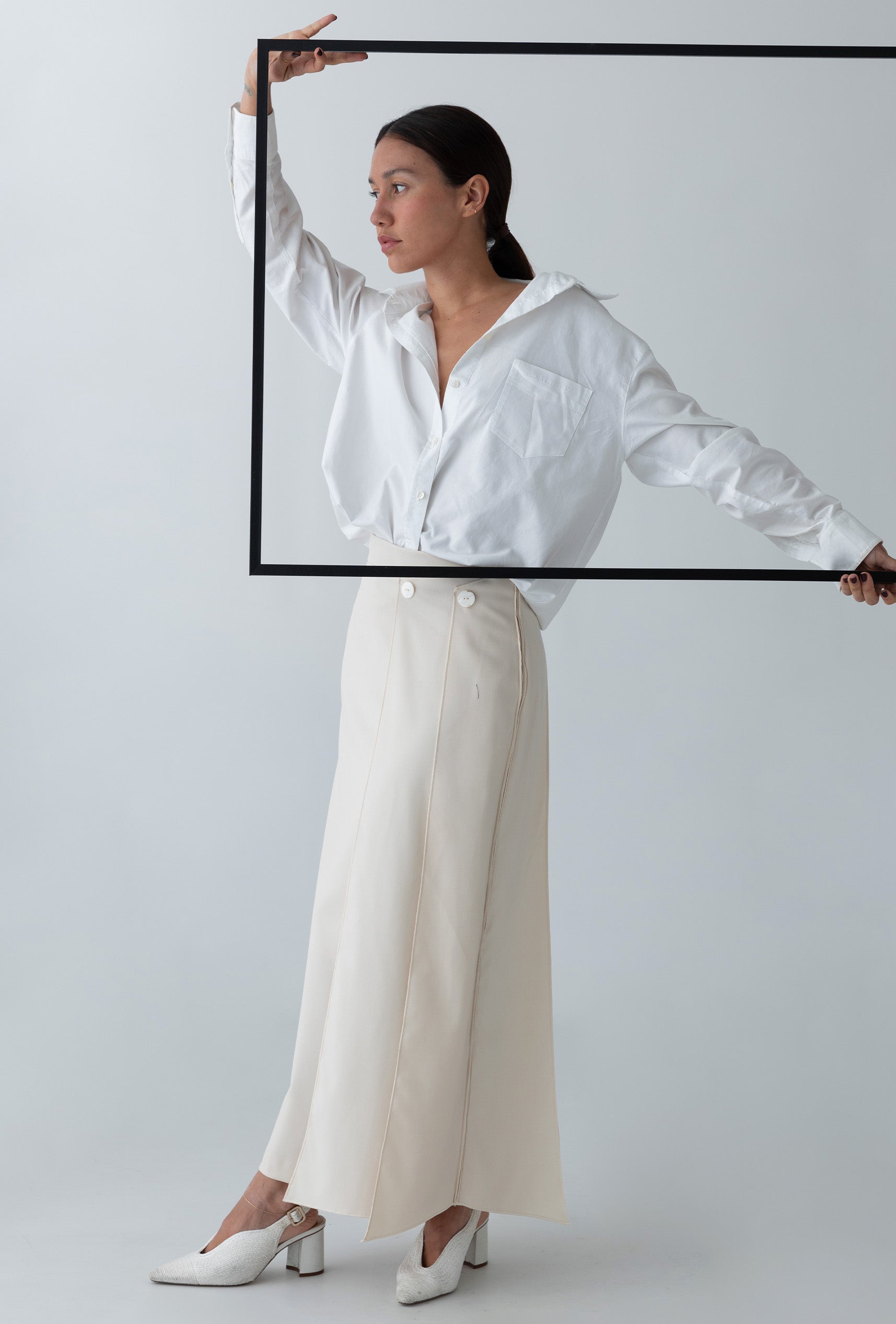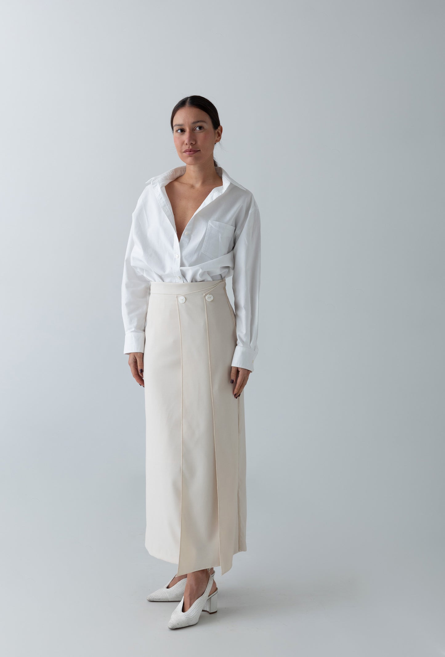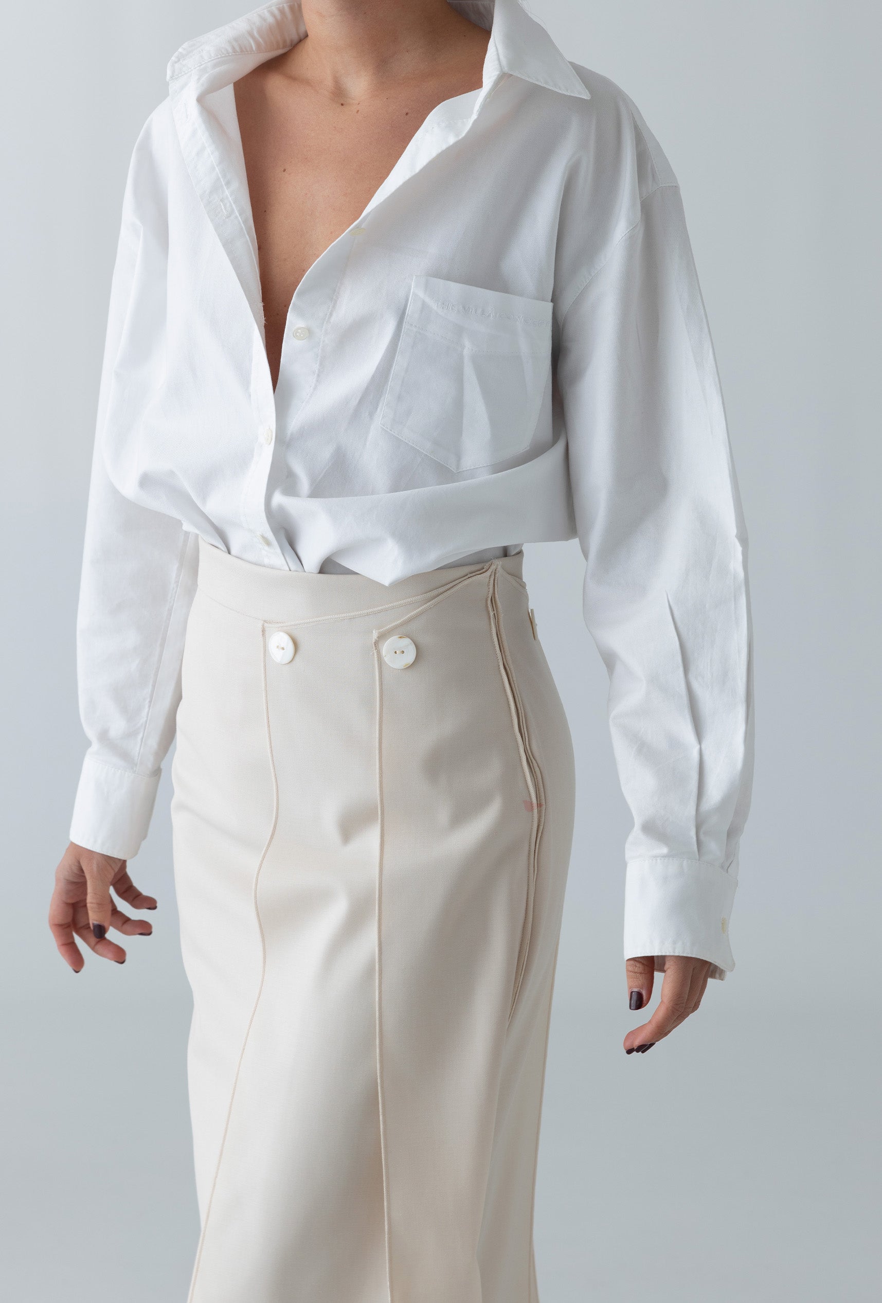 Falda con corte midi en color crema. Esta falda representa una pieza única con un diseño atemporal y elegante.