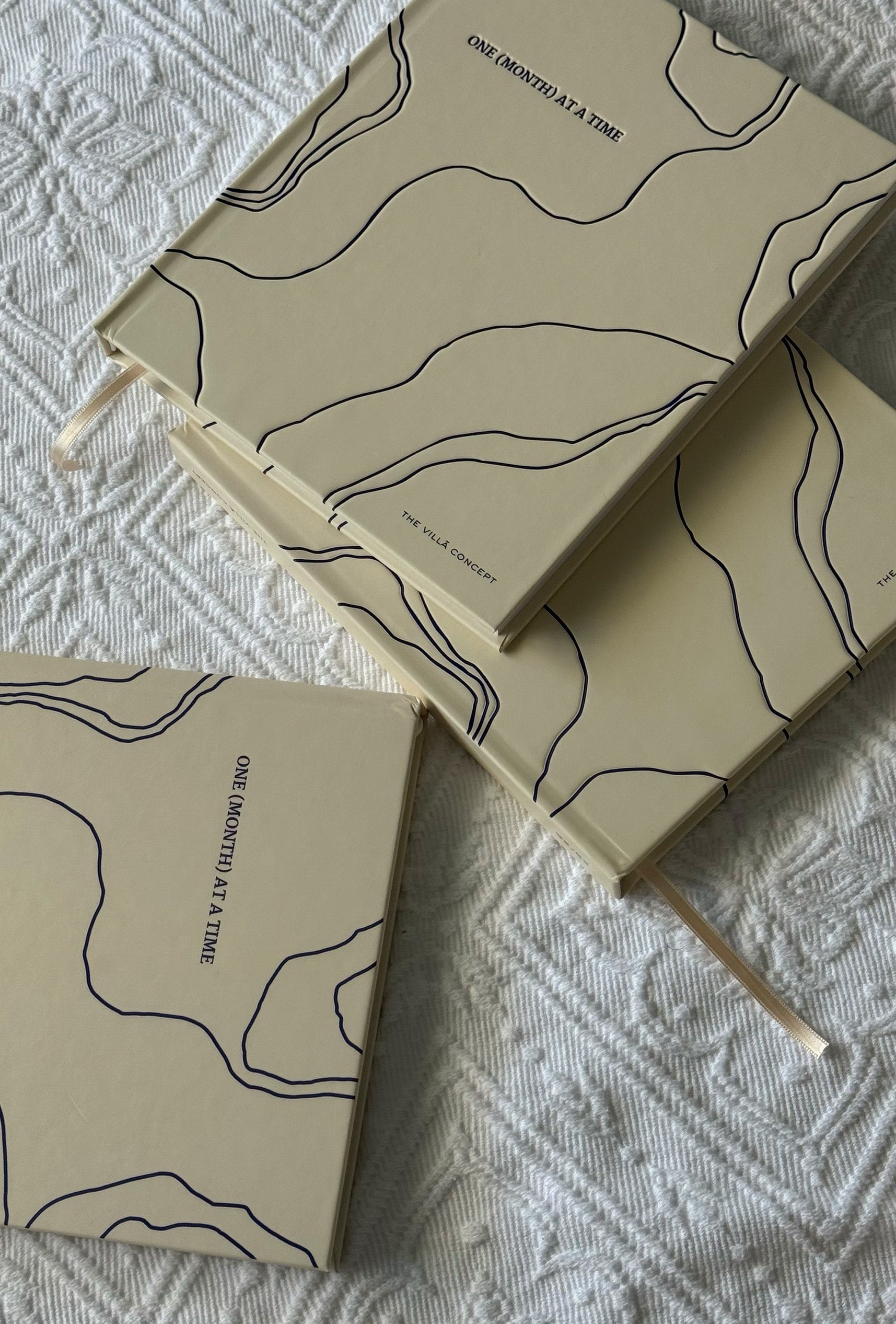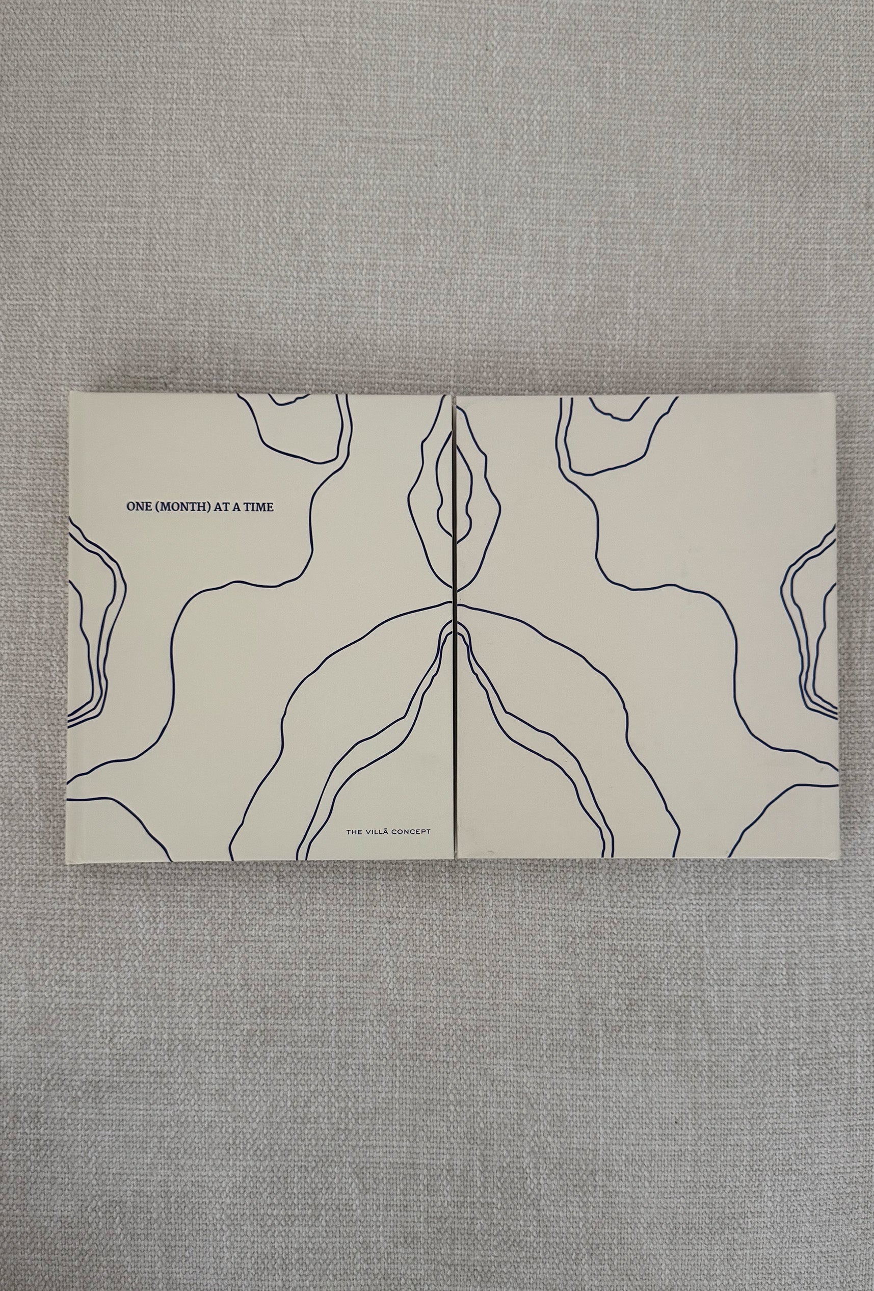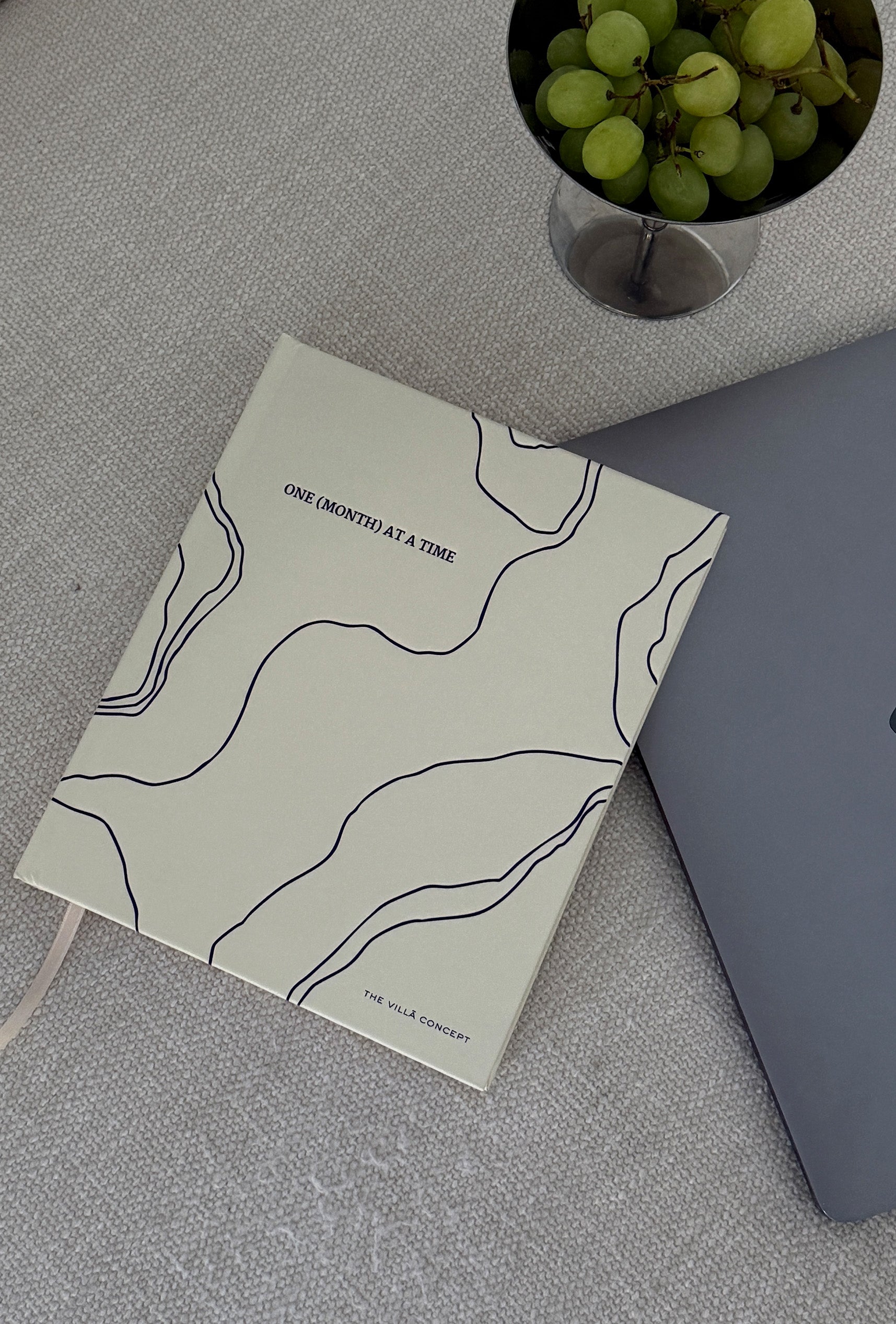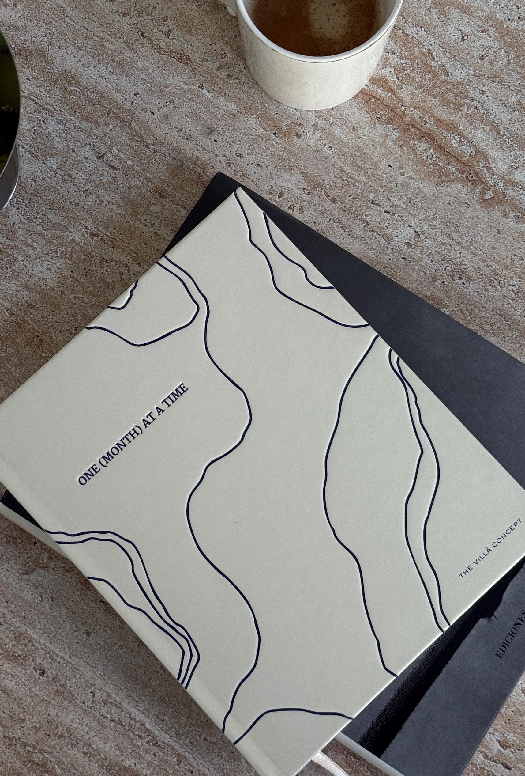 Su cubierta en tapa dura, en tono mantequilla, está intervenida por líneas irregulares en azul marino que simulan grietas naturales, aportando carácter. La frase “One (month) at a time” aparece grabada con golpe en seco, creando uN hundimiento que refuerza su diseño minimalista y atemporal.