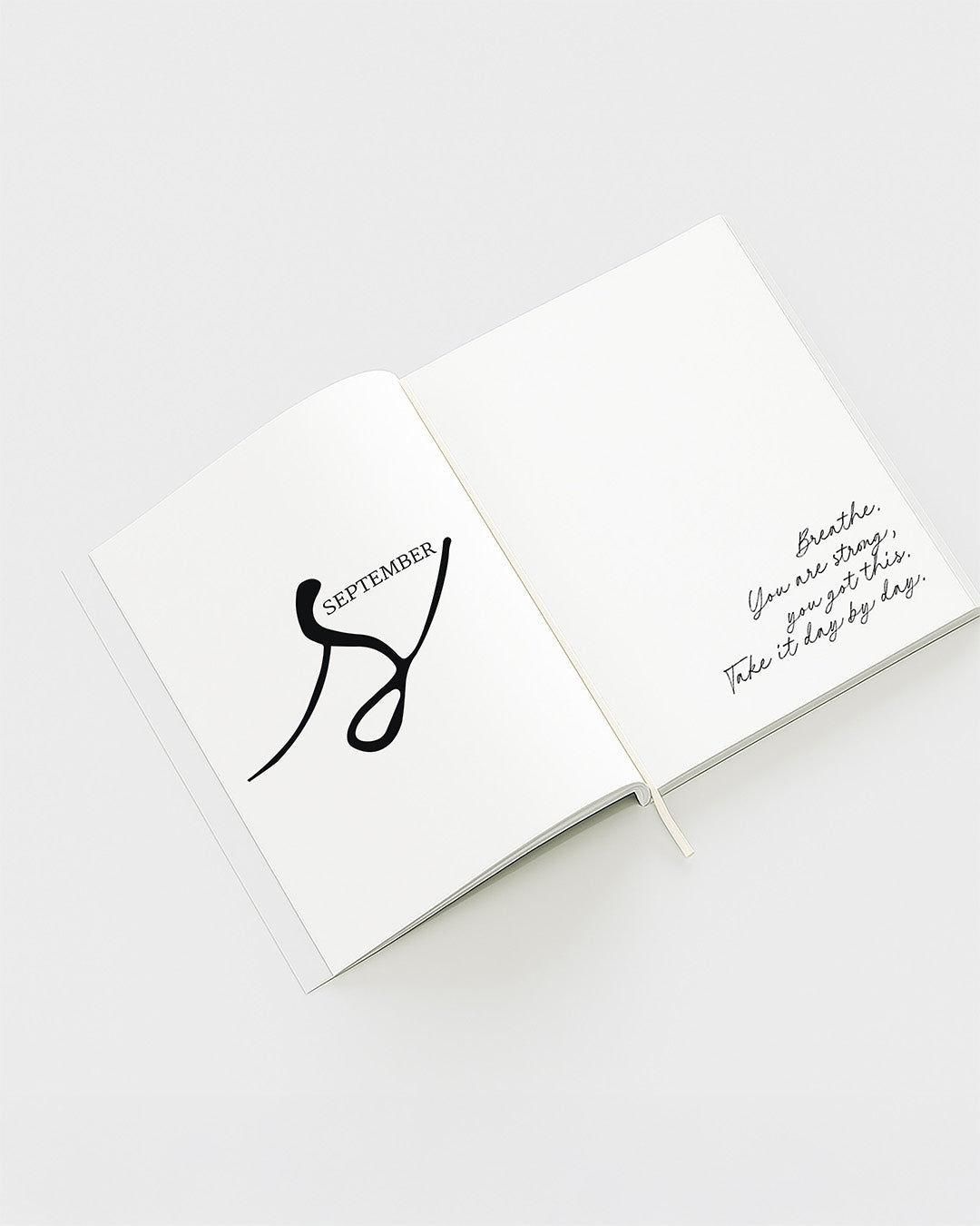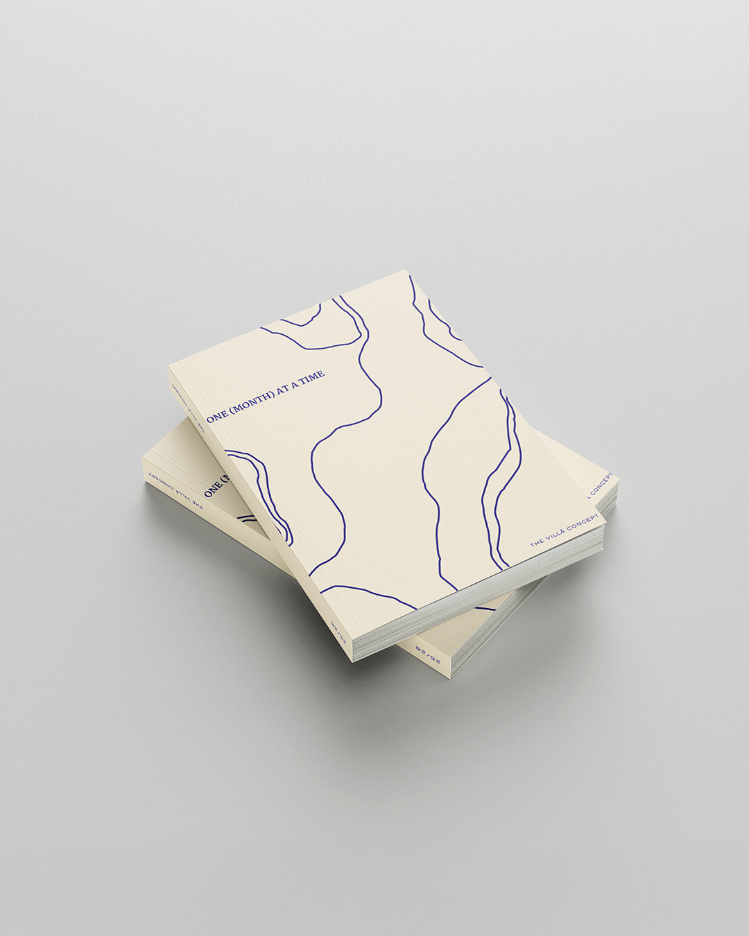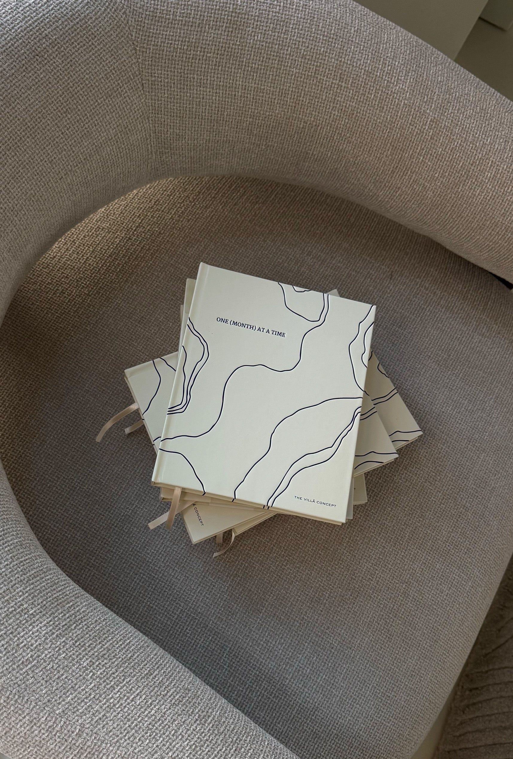 Su cubierta en tapa dura, en tono mantequilla, está intervenida por líneas irregulares en azul marino que simulan grietas naturales, aportando carácter. La frase “One (month) at a time” aparece grabada con golpe en seco, creando uN hundimiento que refuerza su diseño minimalista y atemporal.