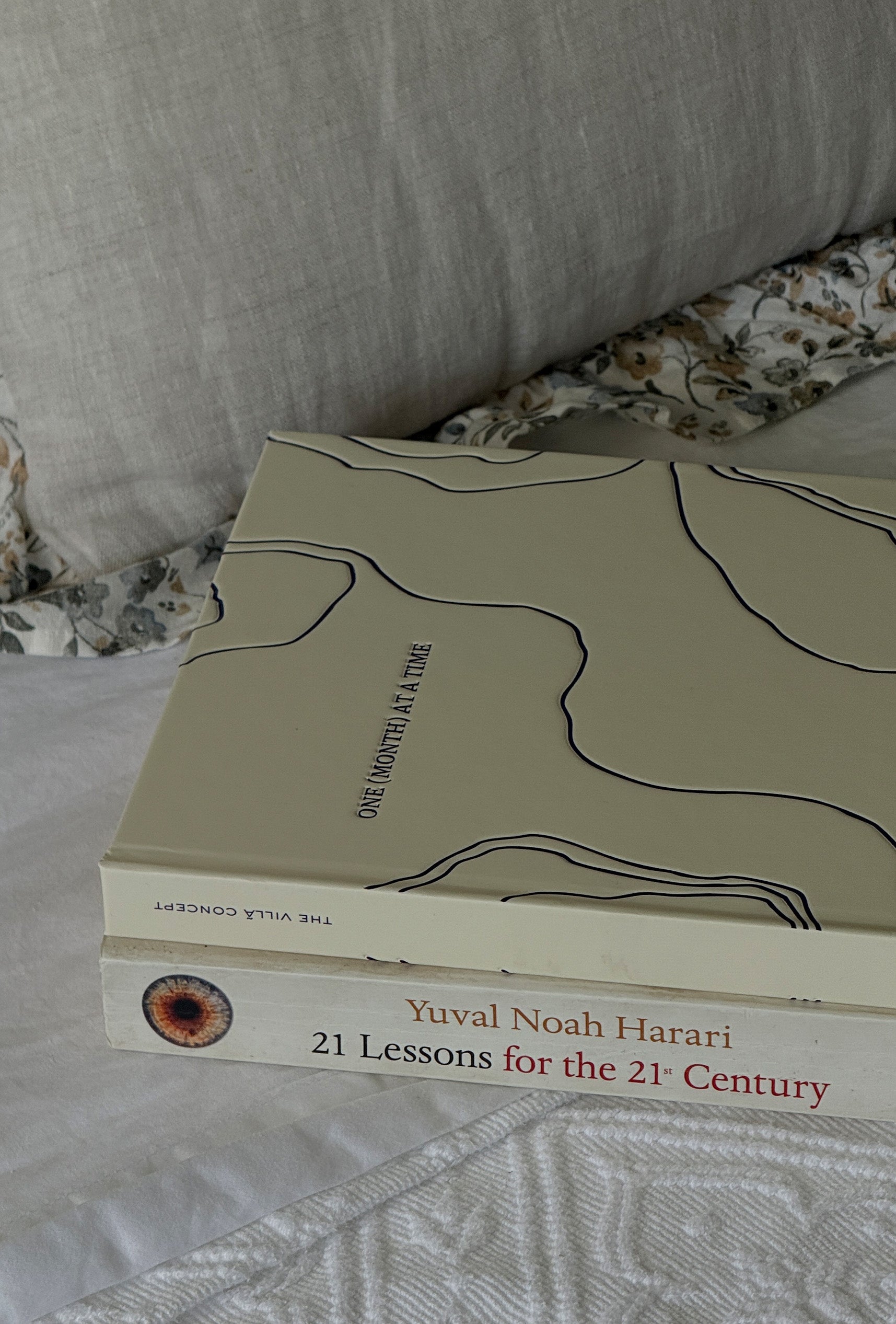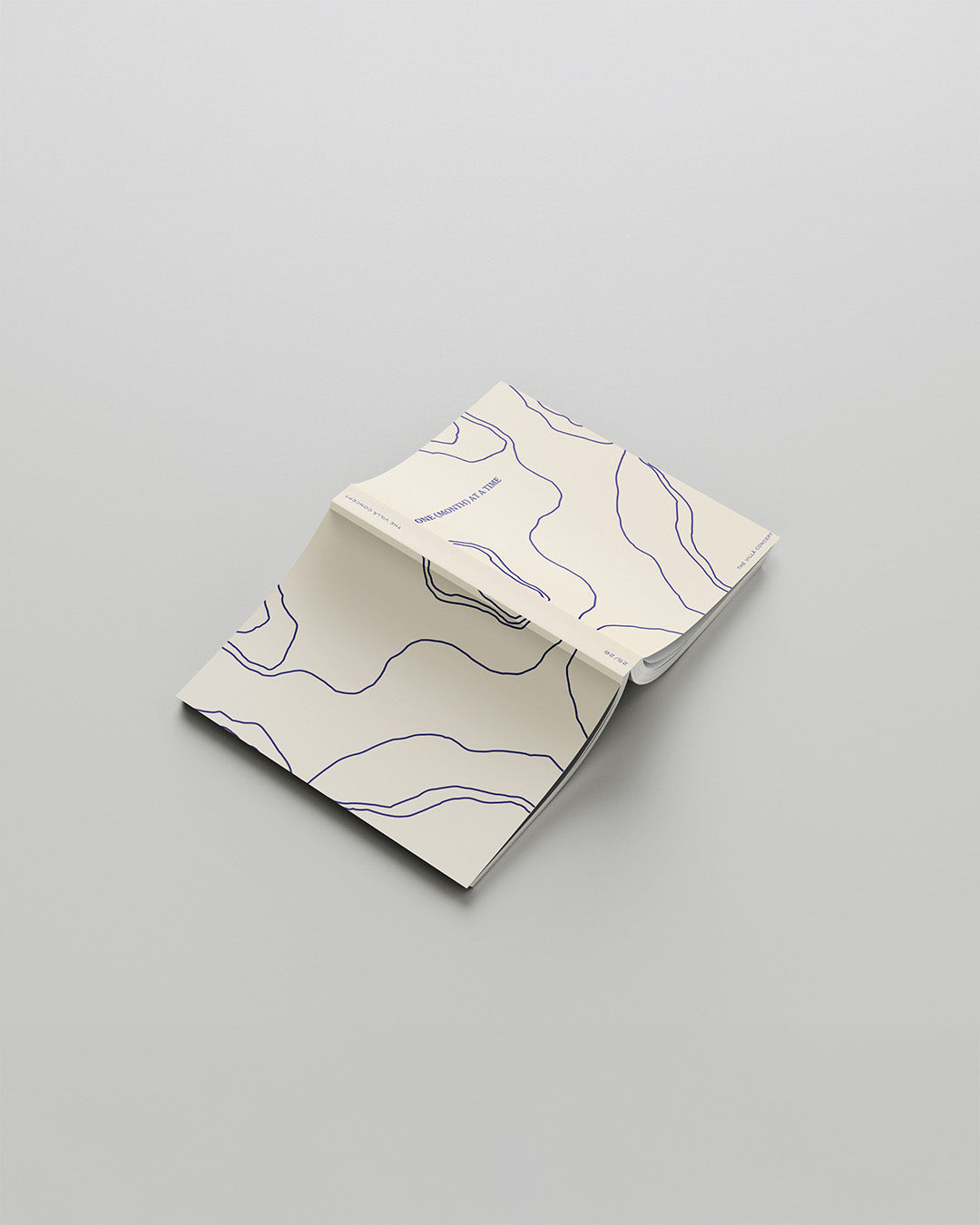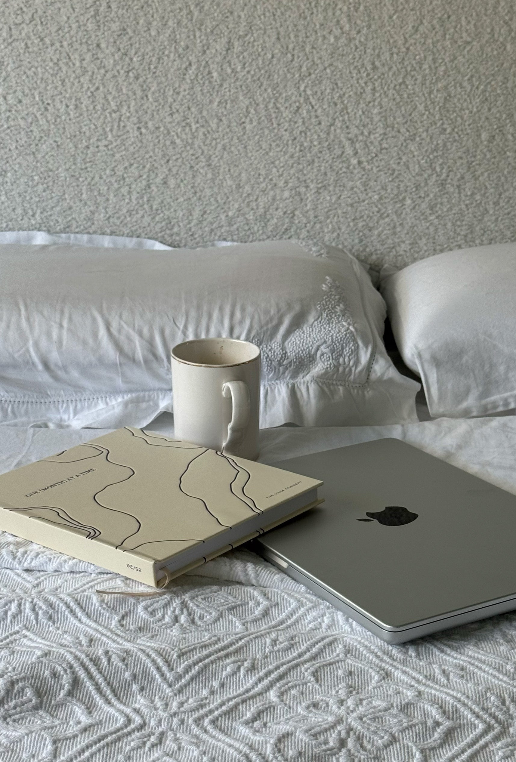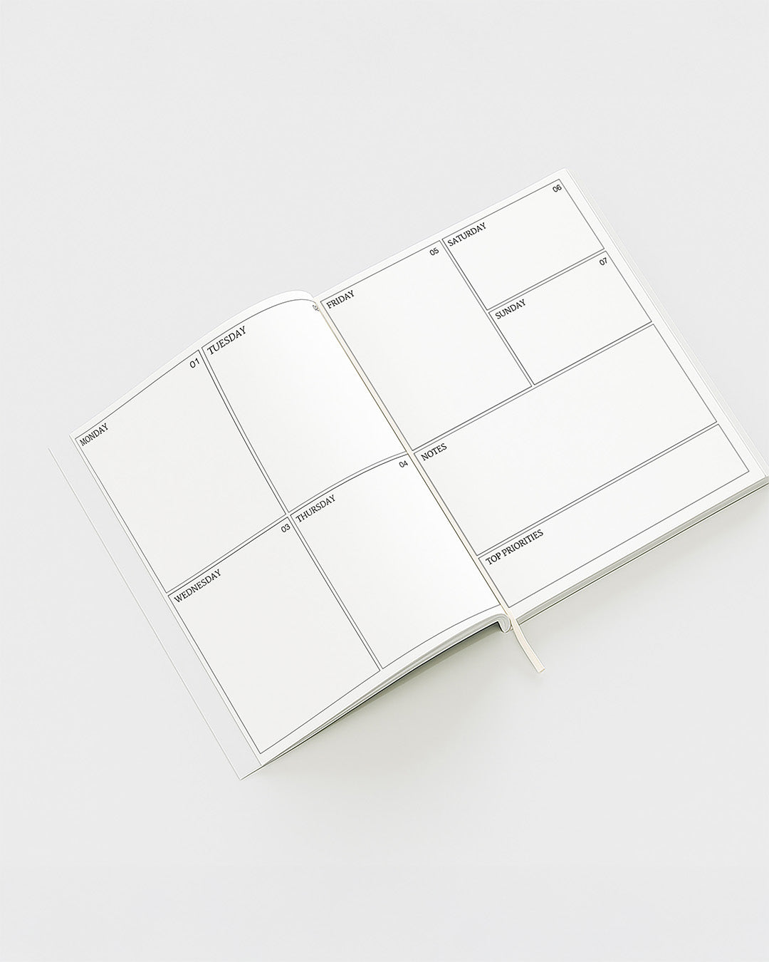 Su cubierta en tapa dura, en tono mantequilla, está intervenida por líneas irregulares en azul marino que simulan grietas naturales, aportando carácter. La frase “One (month) at a time” aparece grabada con golpe en seco, creando uN hundimiento que refuerza su diseño minimalista y atemporal.