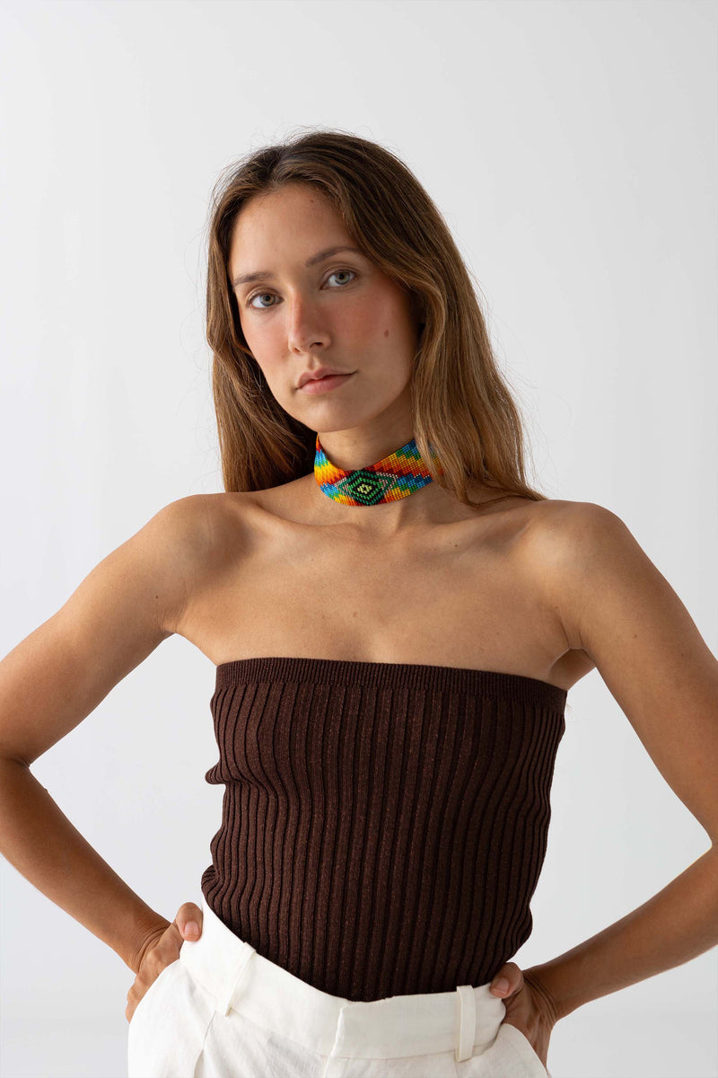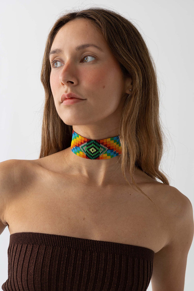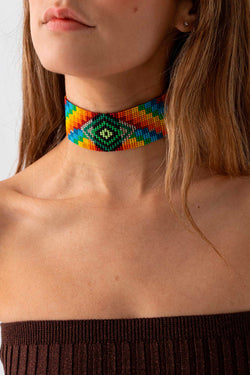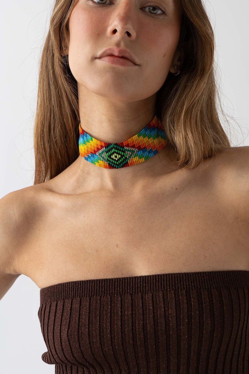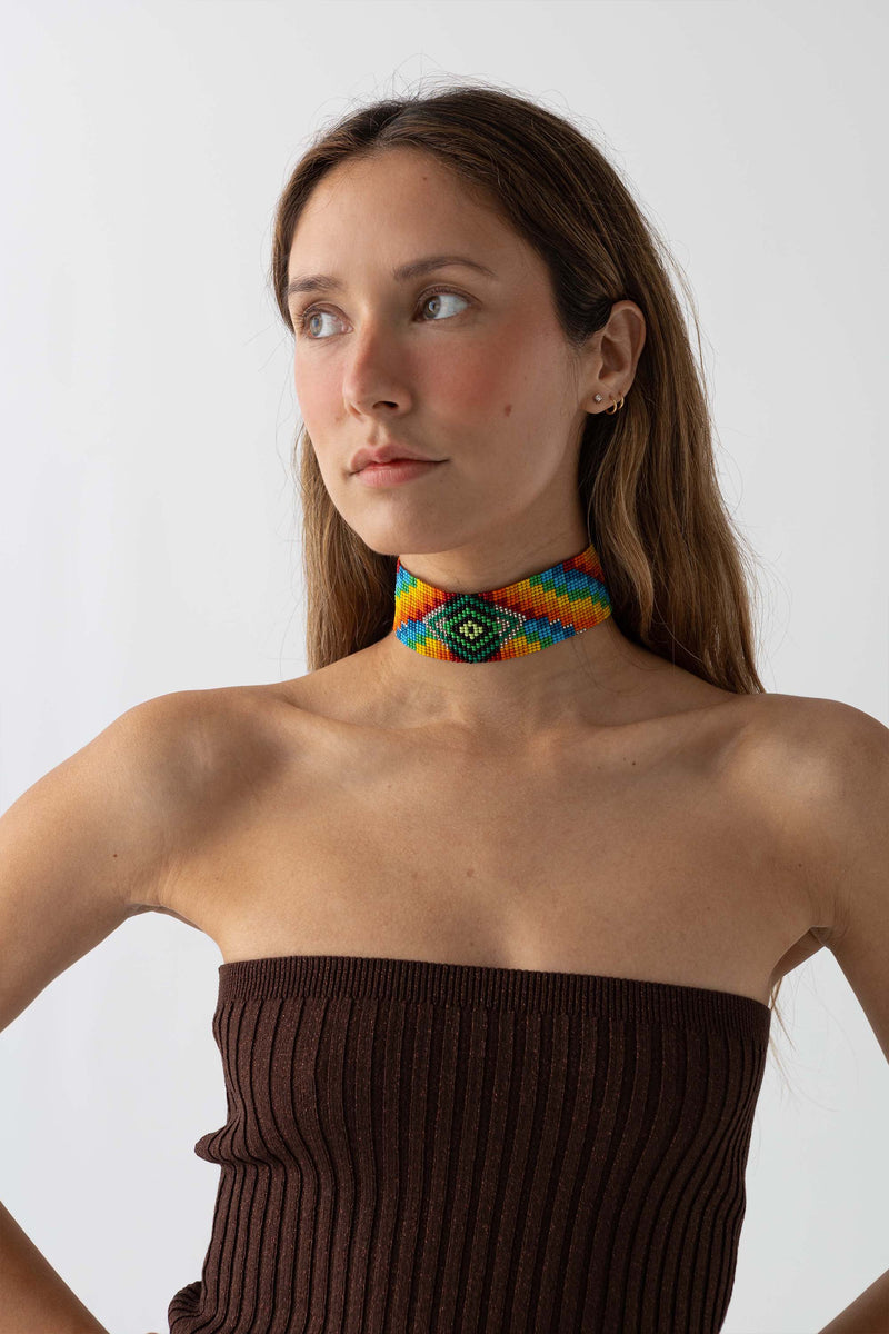 This Choker has been handmade following the ancestral practices of the Emberá, an Amerindian people who live in Colombia. Each piece is unique and original in its design and carries centuries of history and symbolism.