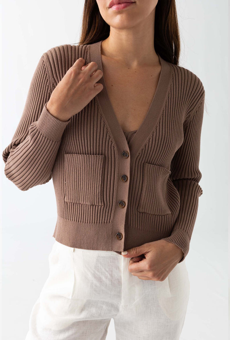 The long-sleeved cardigan features a sleek, understated silhouette. Fitted cut at the bust and waist with a flattering V-neckline. Front opening with button closure.