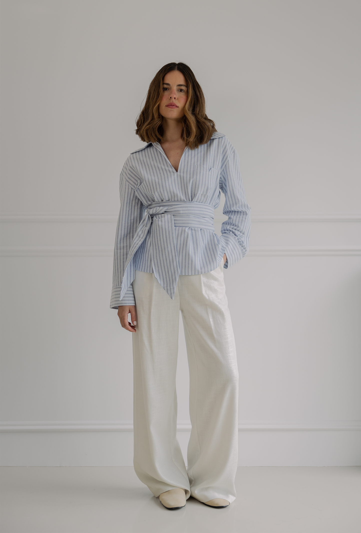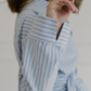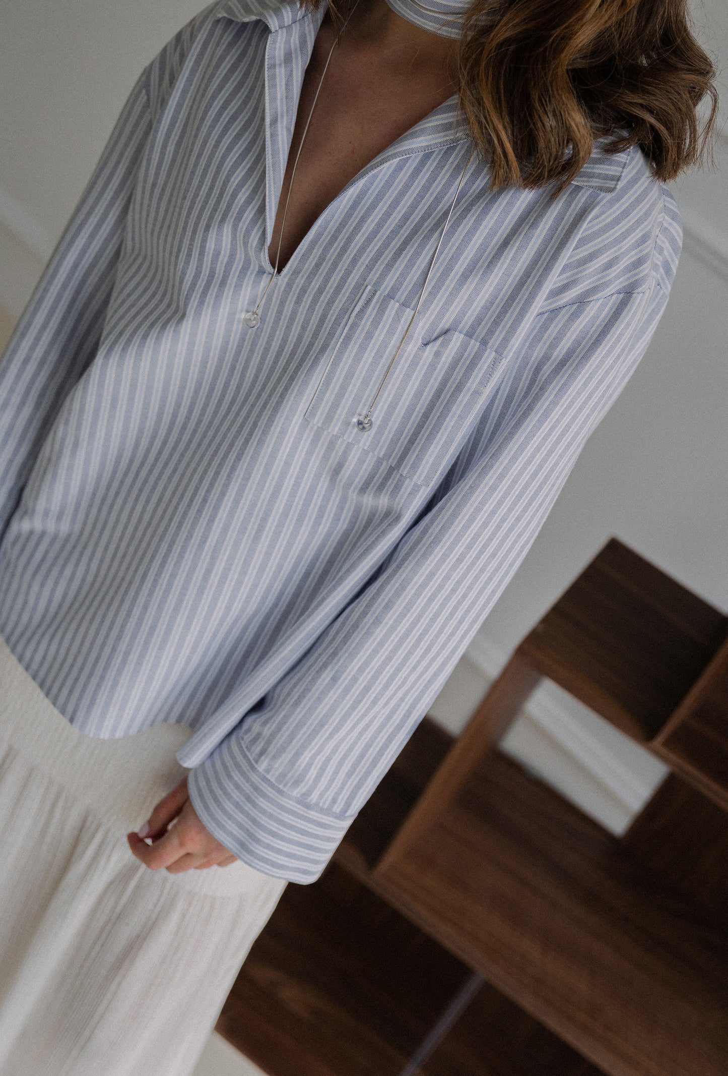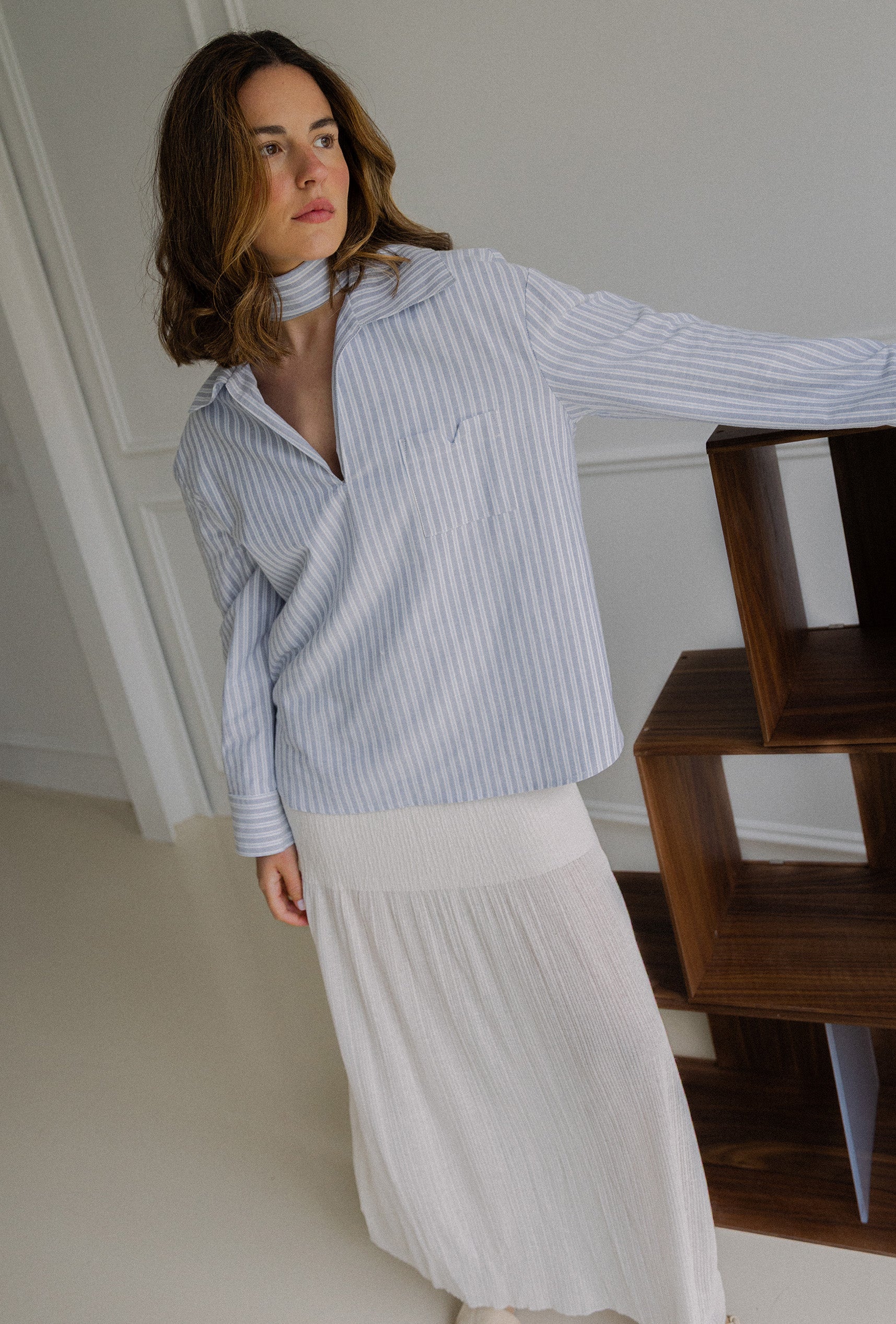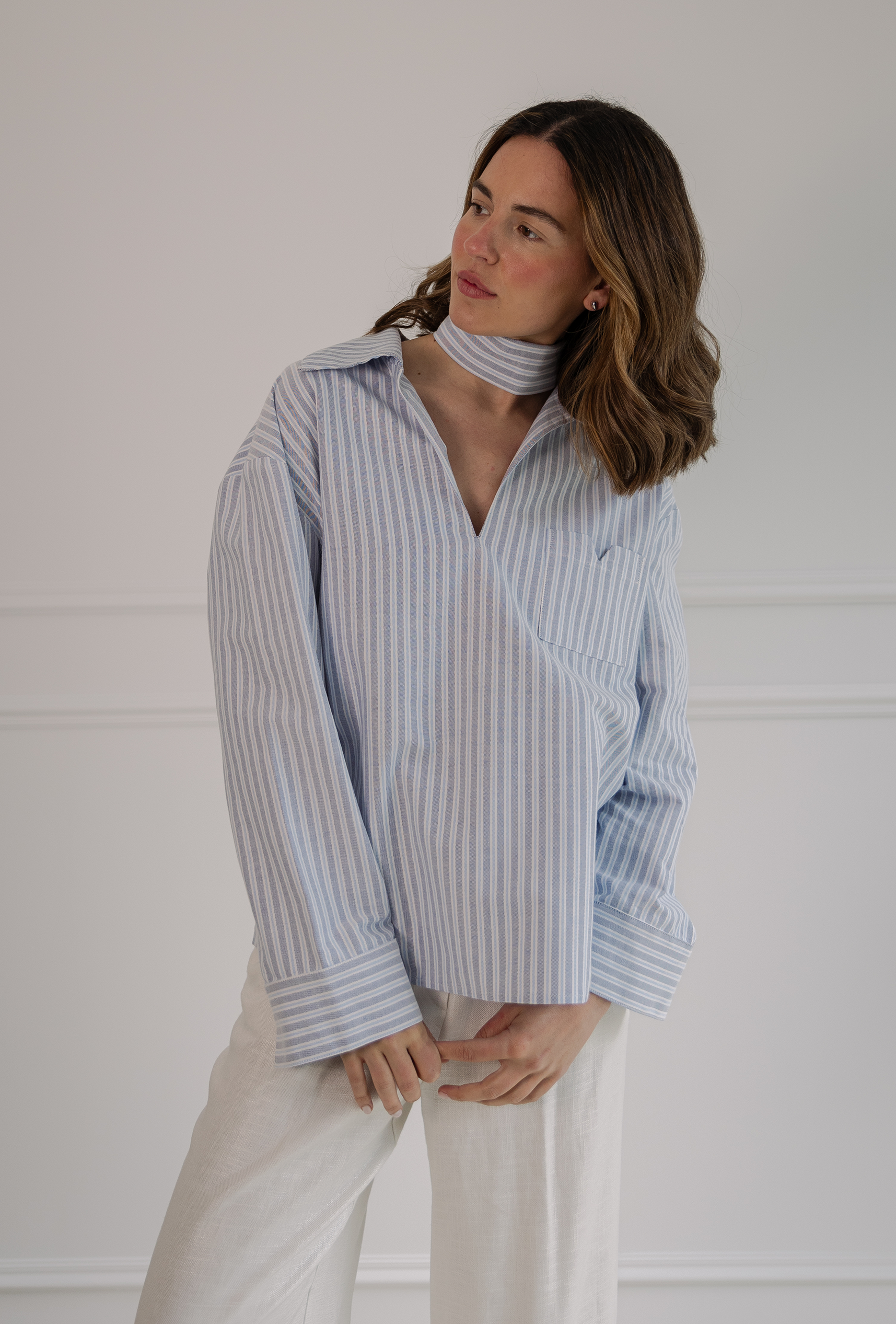 White and blue striped shirt made from 100% cotton. Its V-neckline visually lengthens the collar and adds a carefree air, while the chest pocket in the shape of a ‘V’, our hallmark - adds character and functionality.