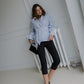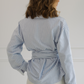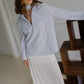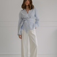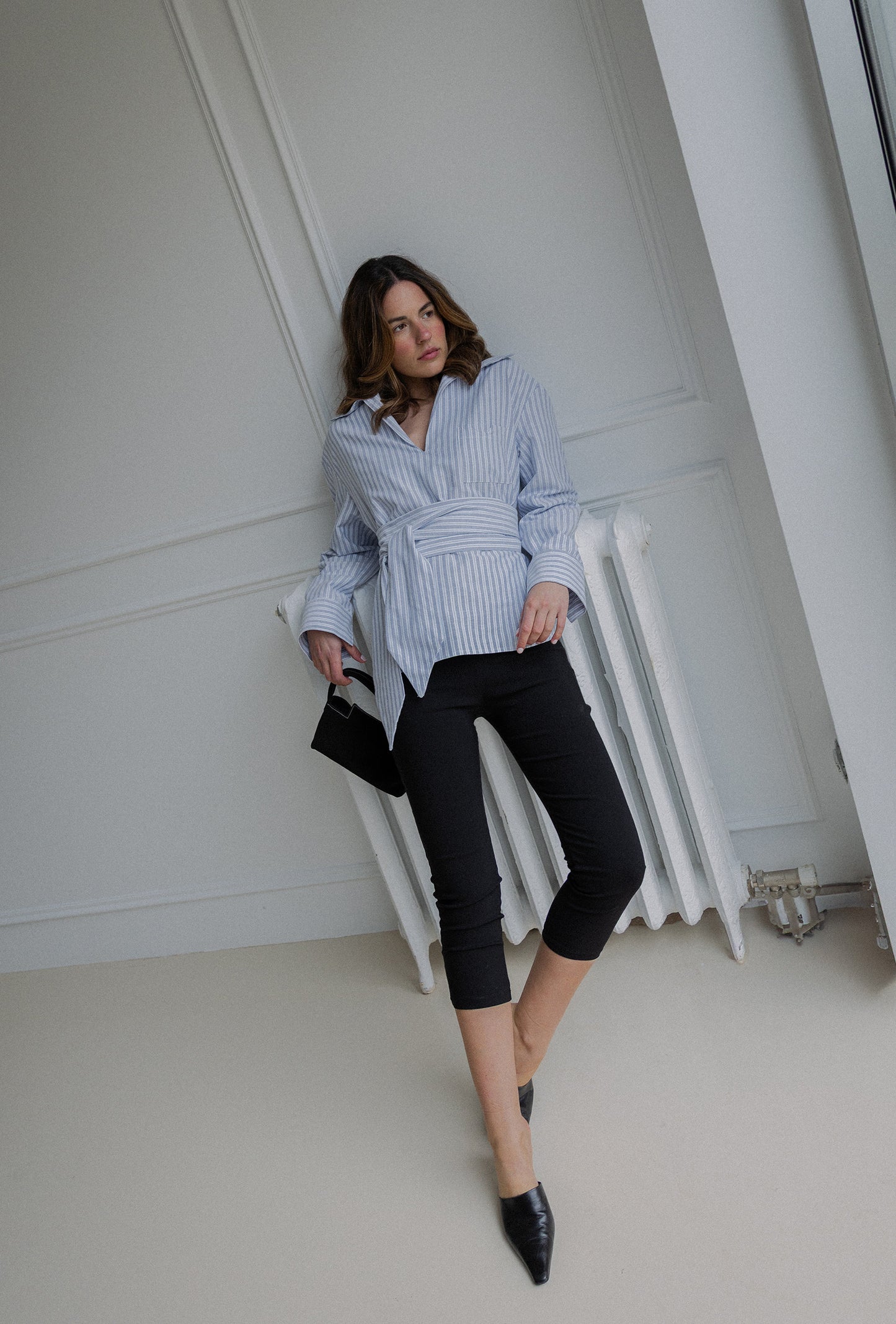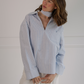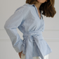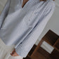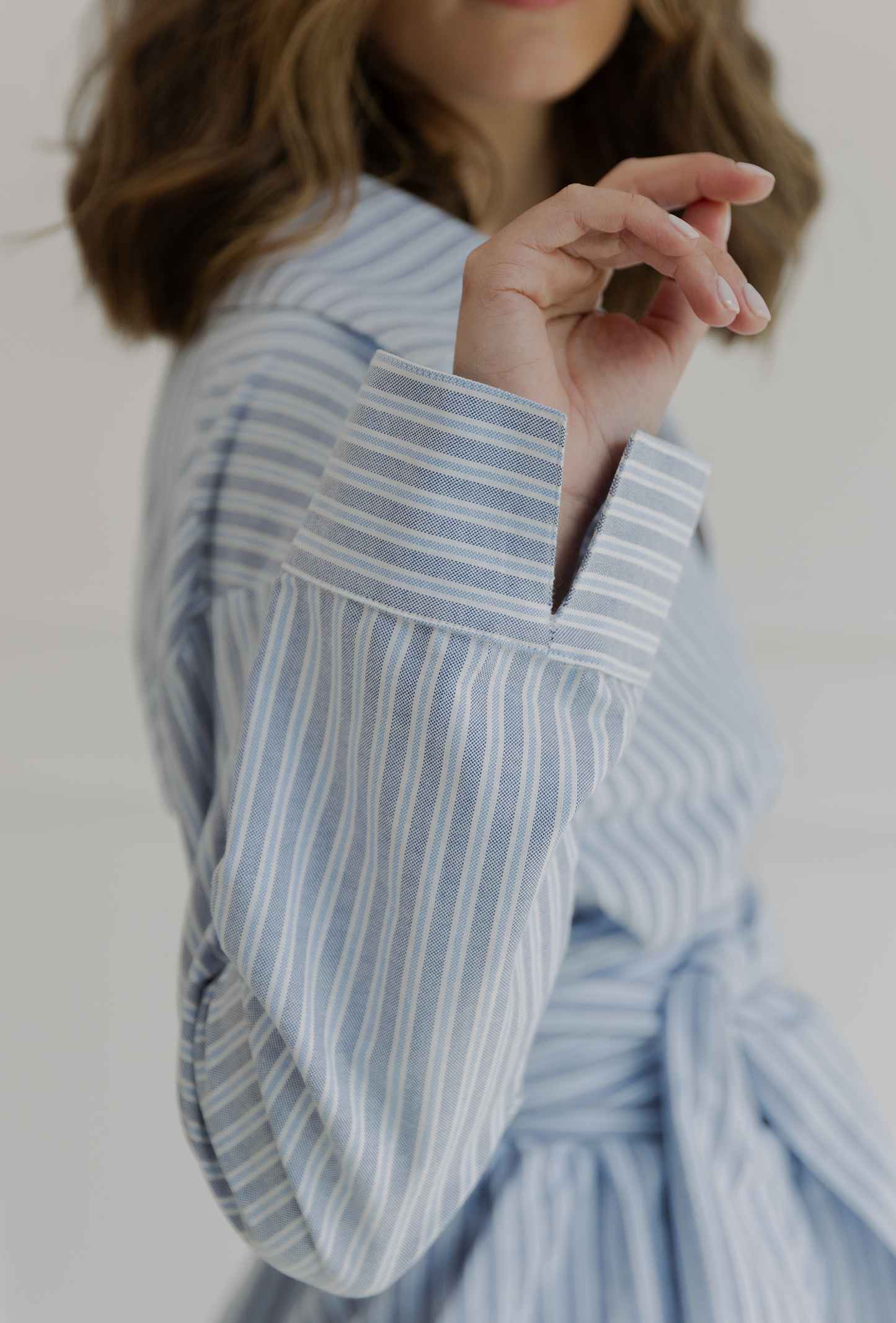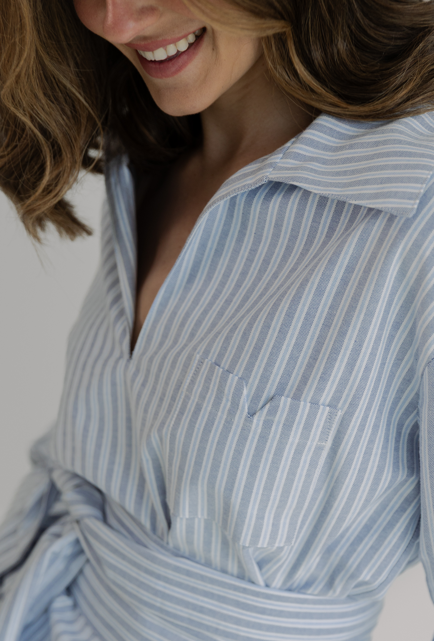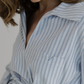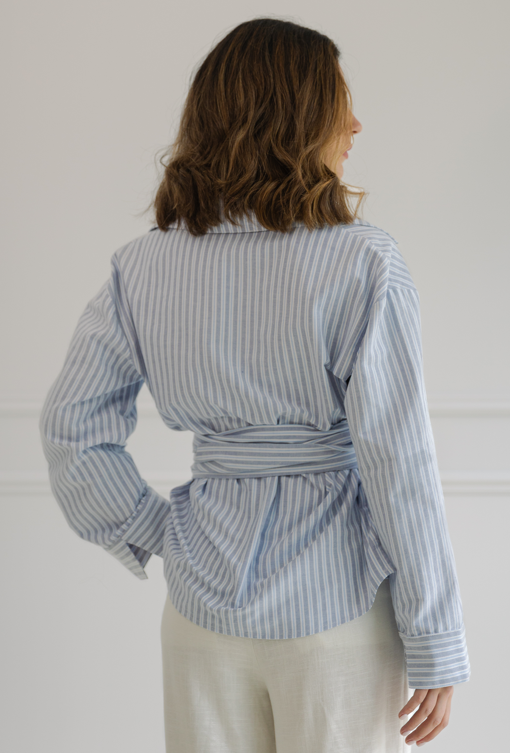 White and blue striped shirt made from 100% cotton. Its V-neckline visually lengthens the collar and adds a carefree air, while the chest pocket in the shape of a ‘V’, our hallmark - adds character and functionality.