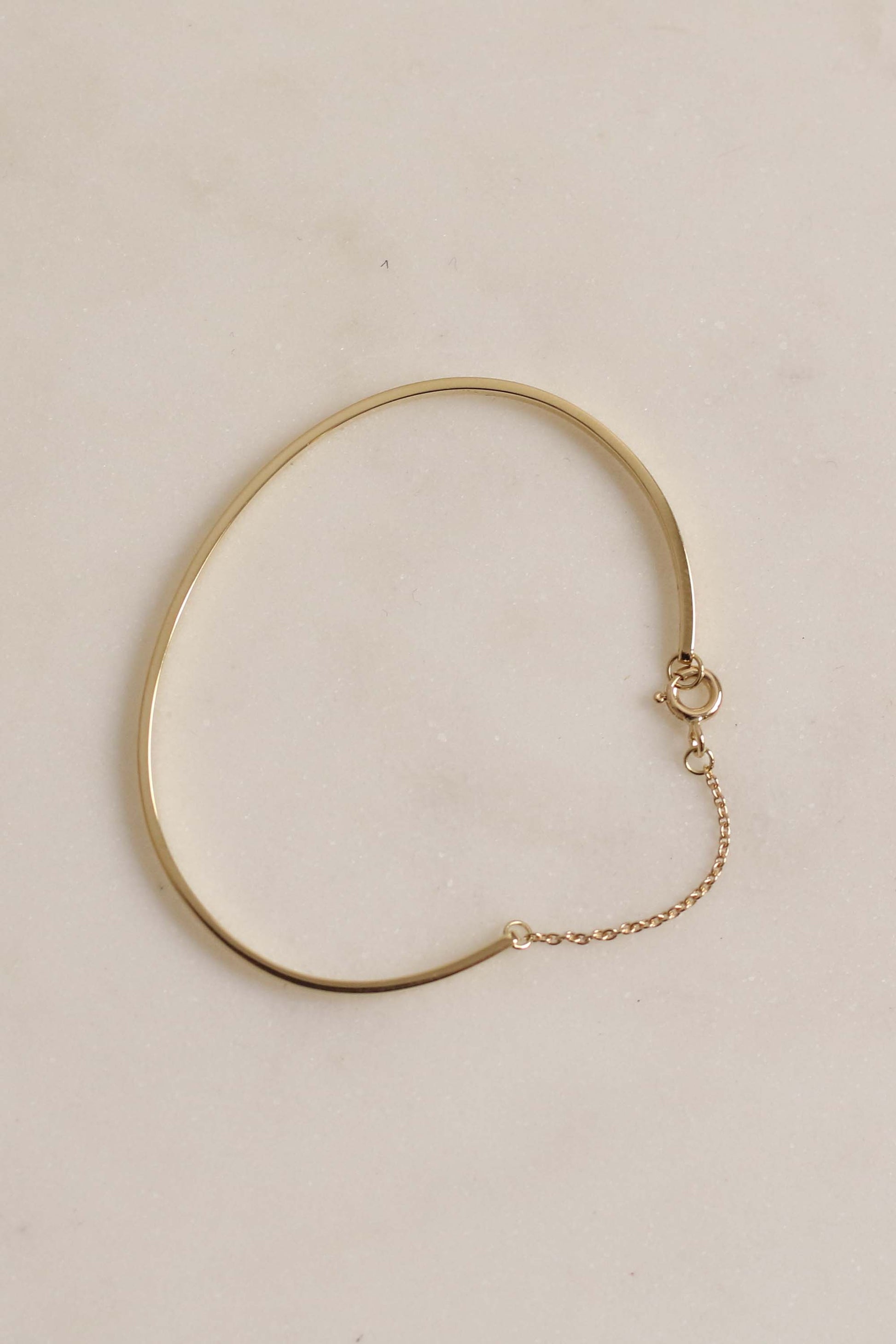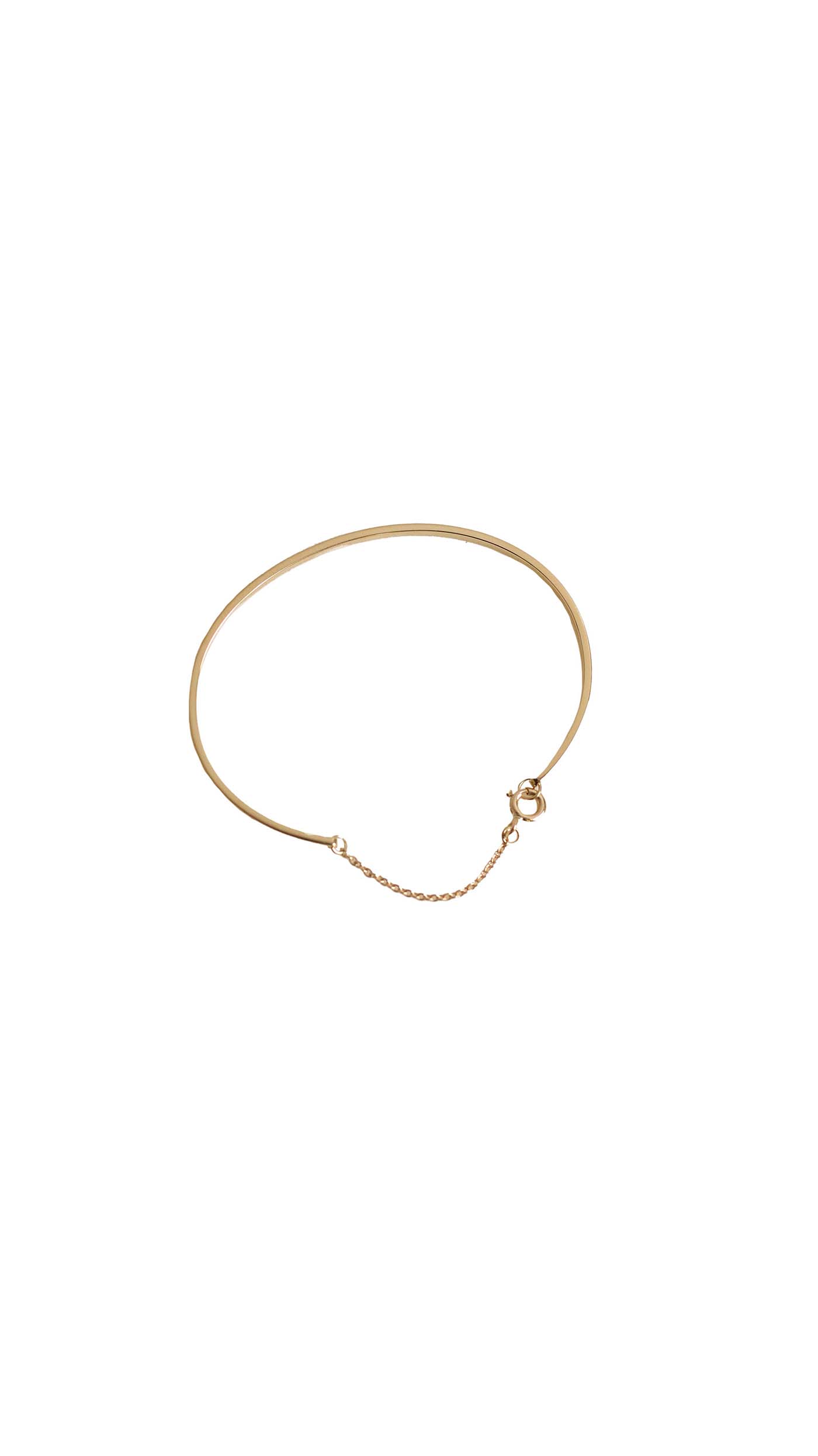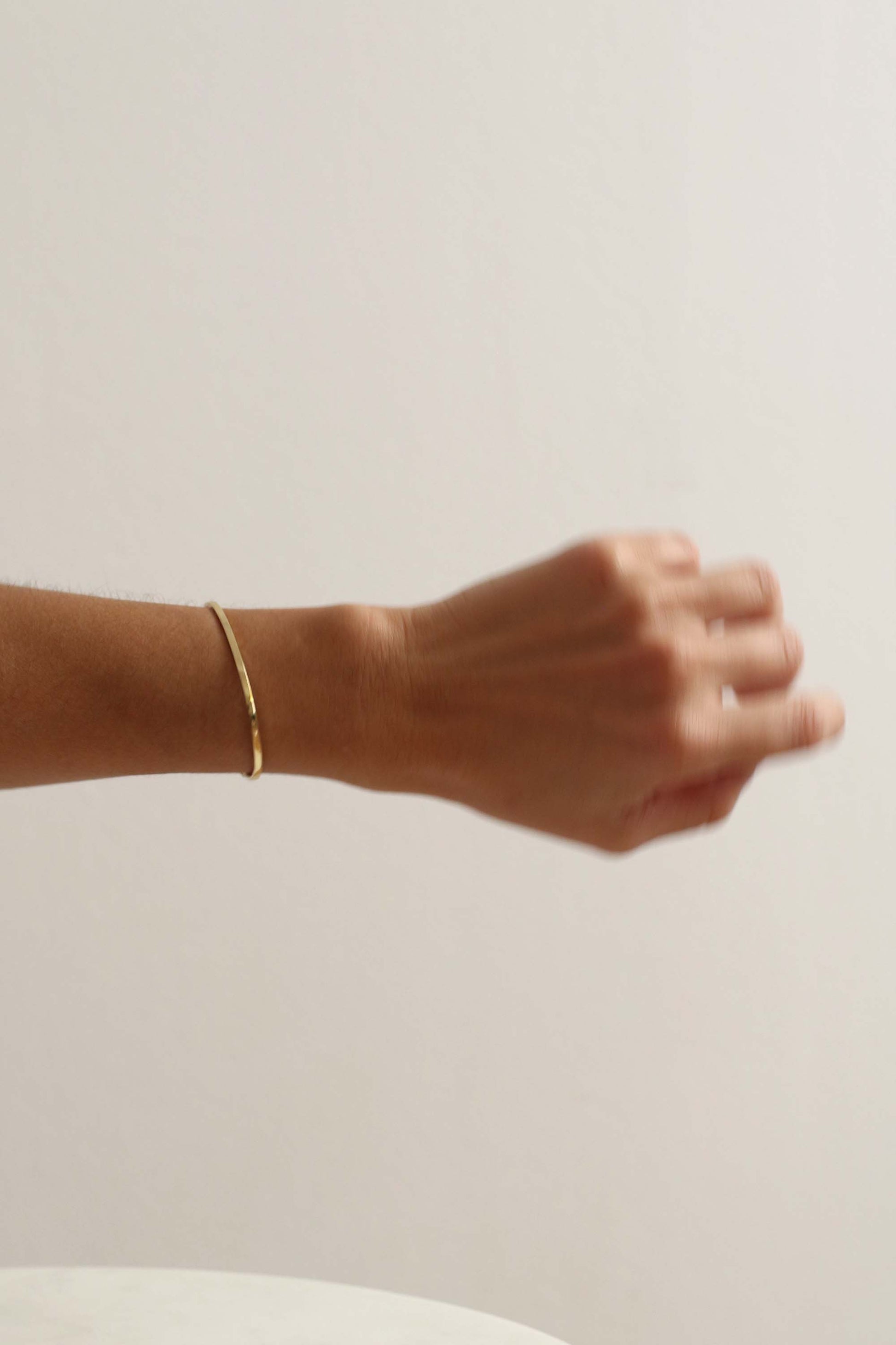 Son design présente une bande qui épouse le poignet et est reliée par une délicate chaîne en or fin 18 carats, idéale pour s'habiller ou être portée au quotidien.