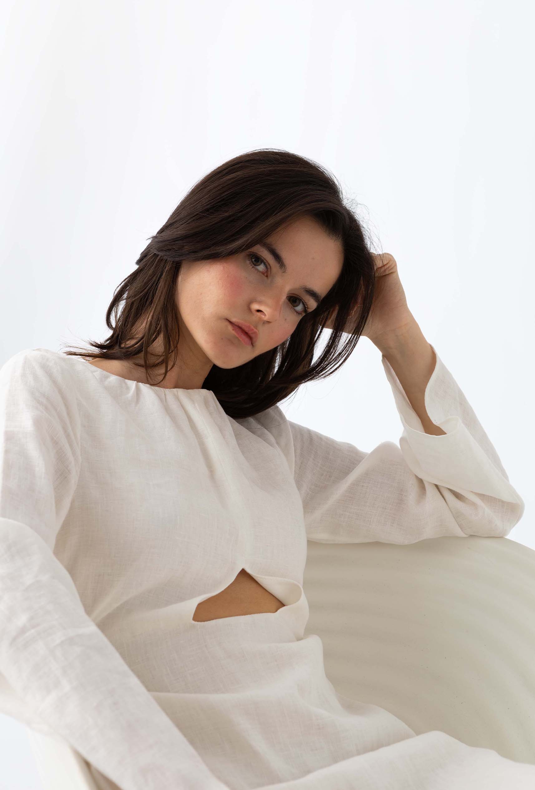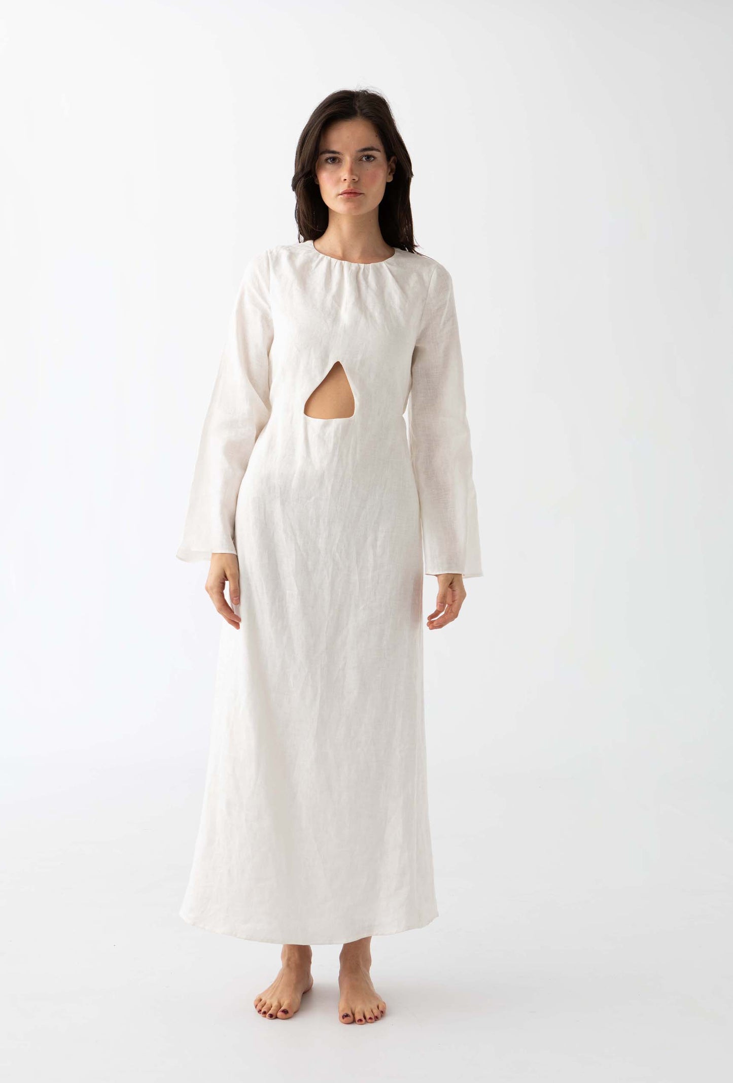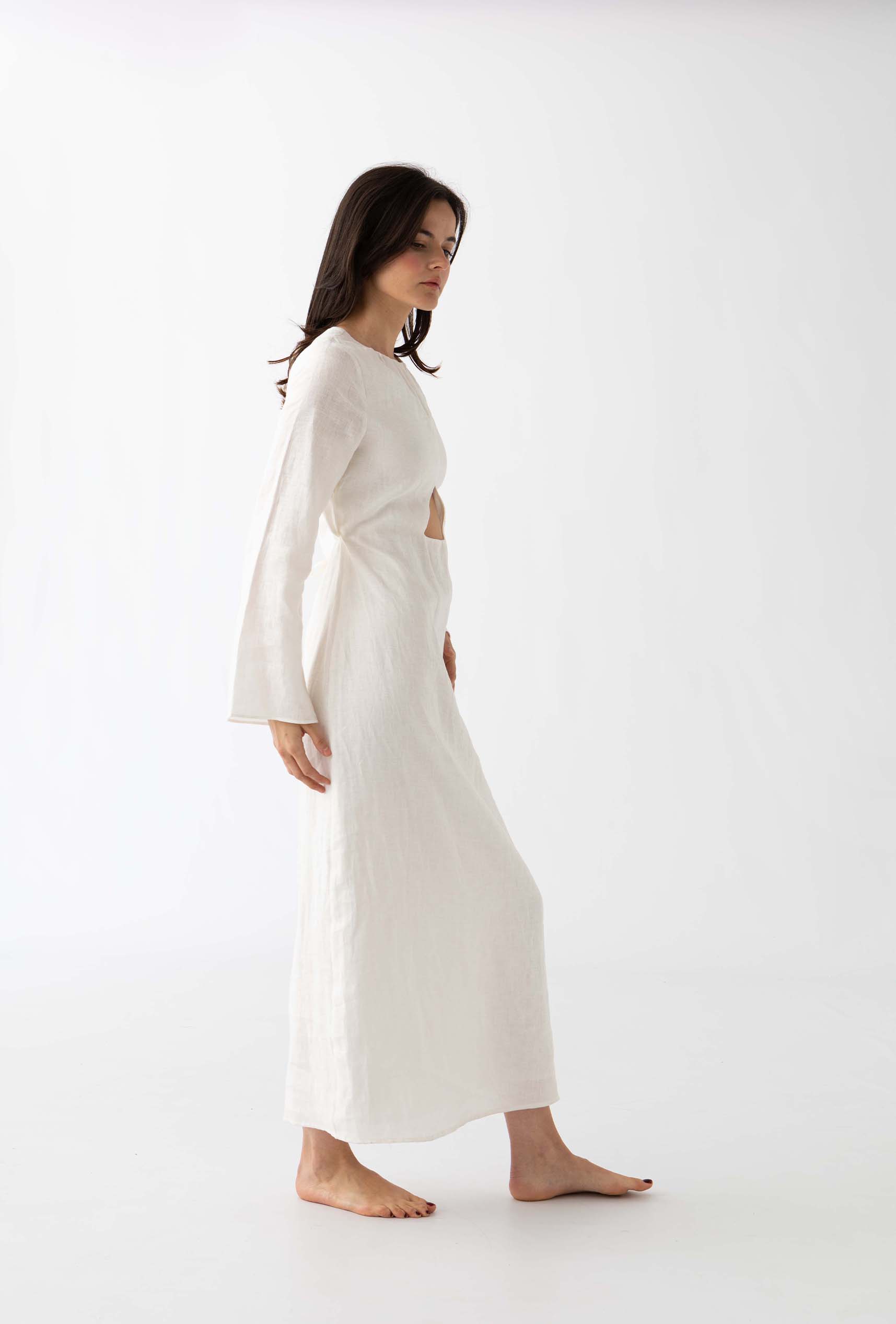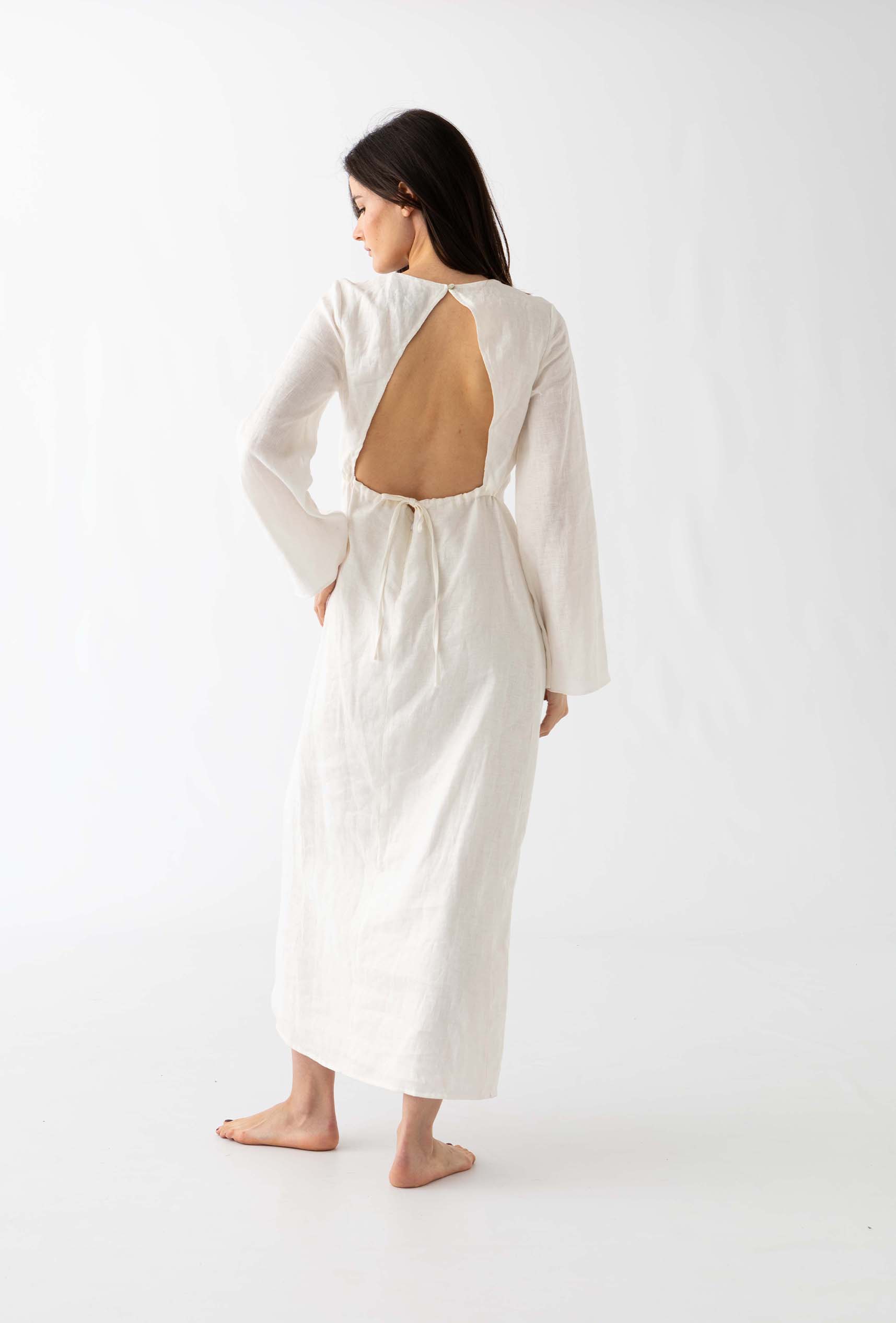 Maxi robe en 100% lin de la meilleure qualité. Dos boutonné et taille élastique ouverte avec nœud, poignets avec boutons effet nacre, poches latérales.