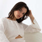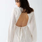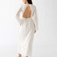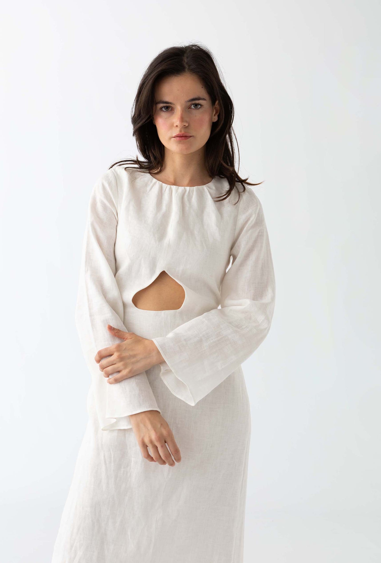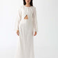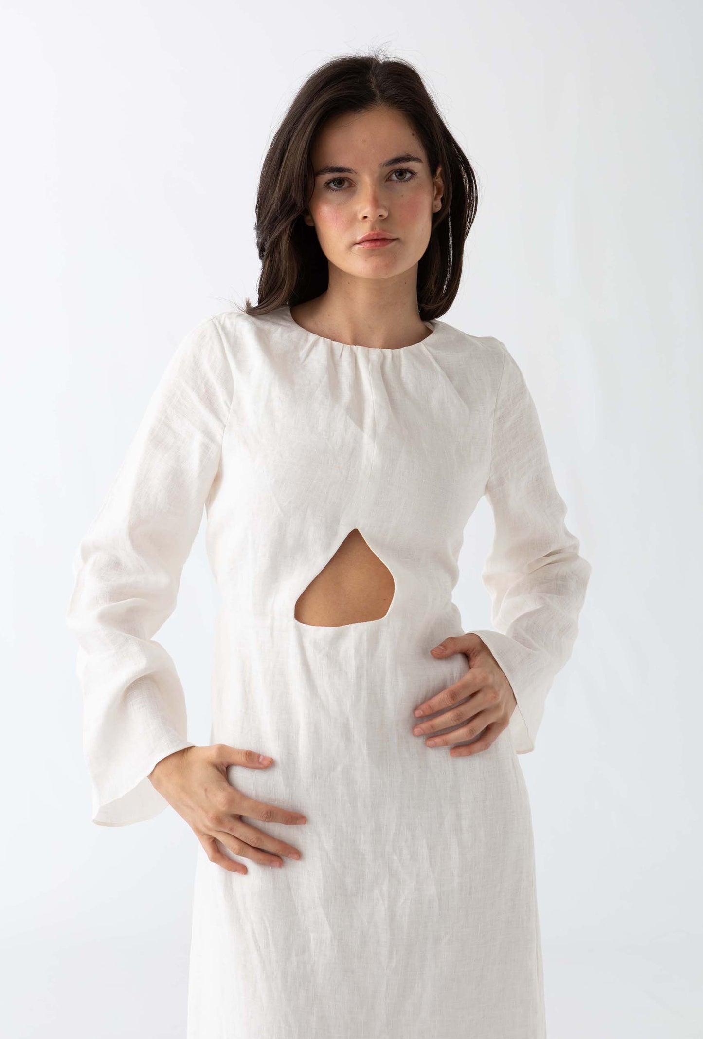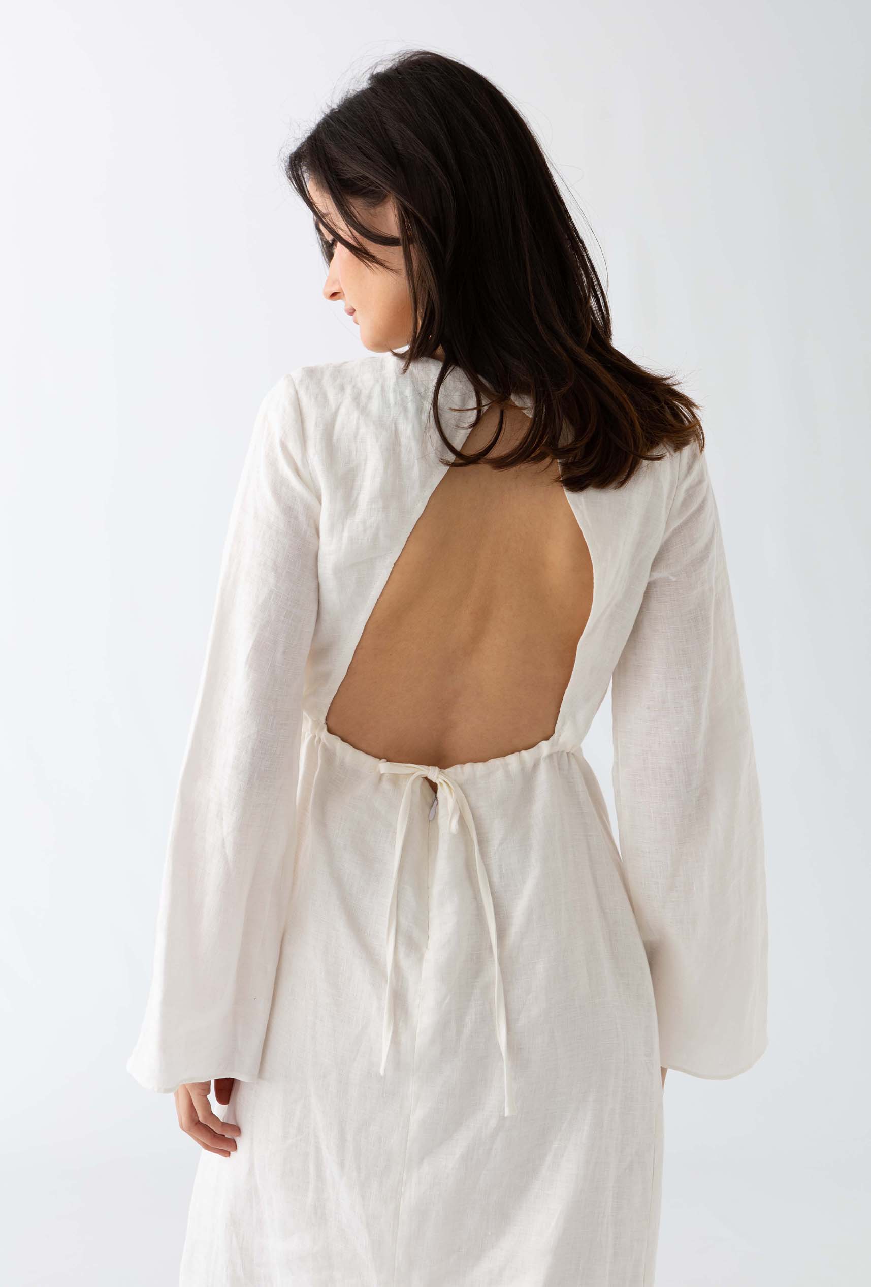 Maxi robe en 100% lin de la meilleure qualité. Dos boutonné et taille élastique ouverte avec nœud, poignets avec boutons effet nacre, poches latérales.
