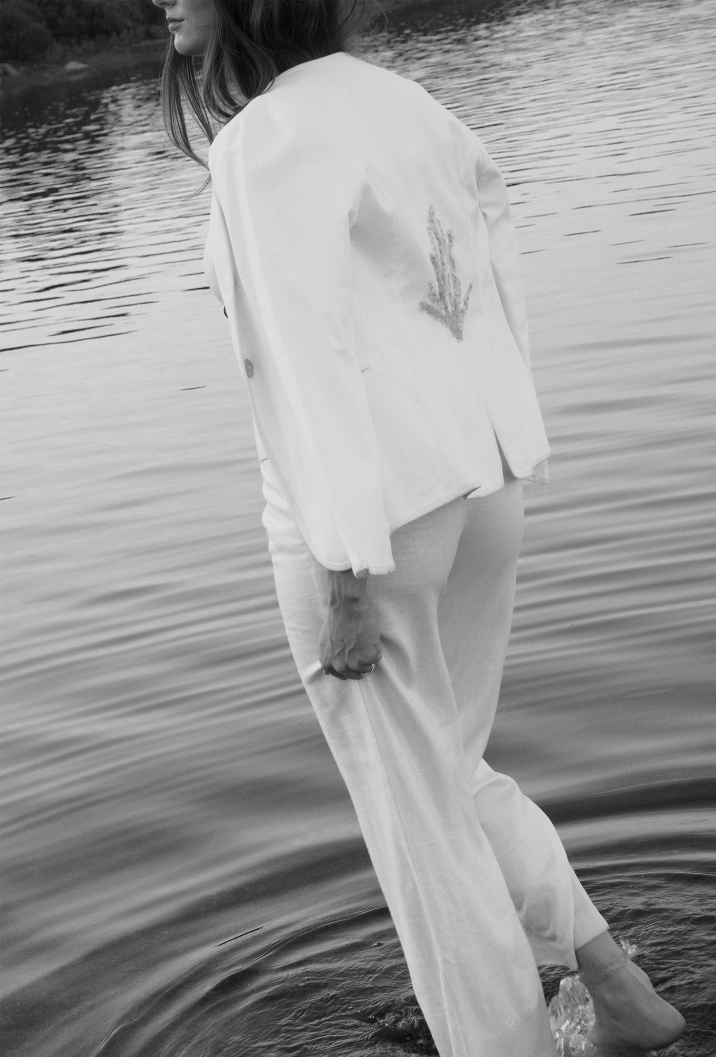 Esta chaqueta destaca por el detalle del coral en la parte trasera, confeccionado artesanalmente con organza. Diseño exclusivo.