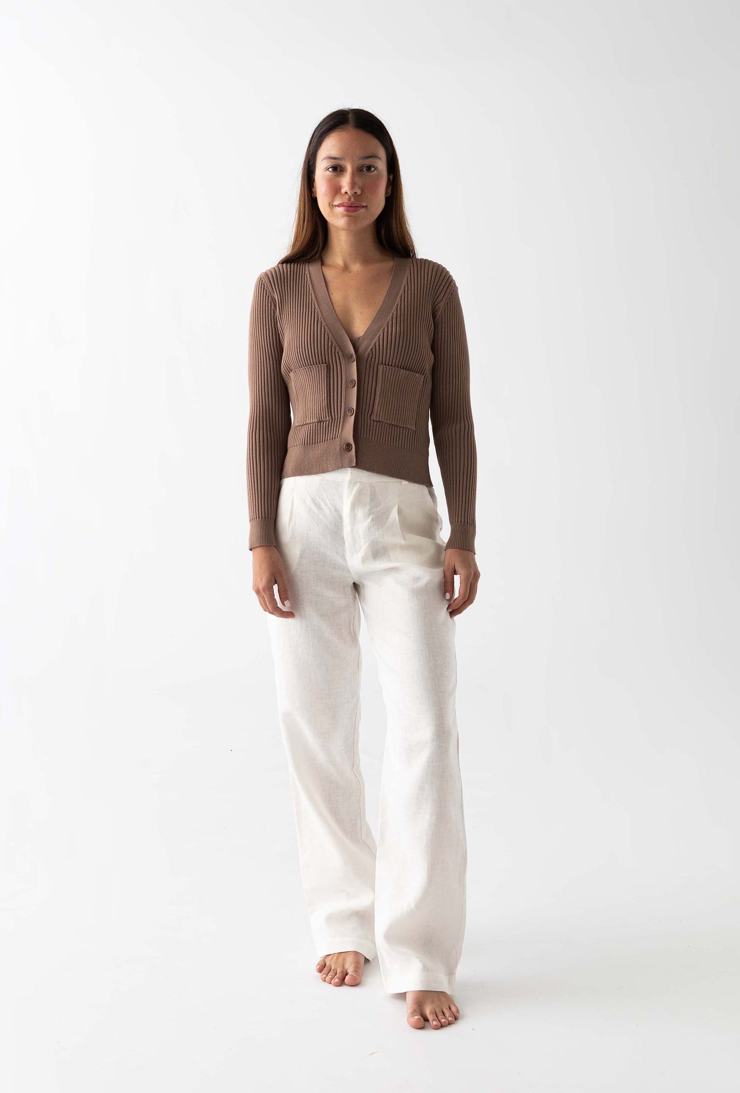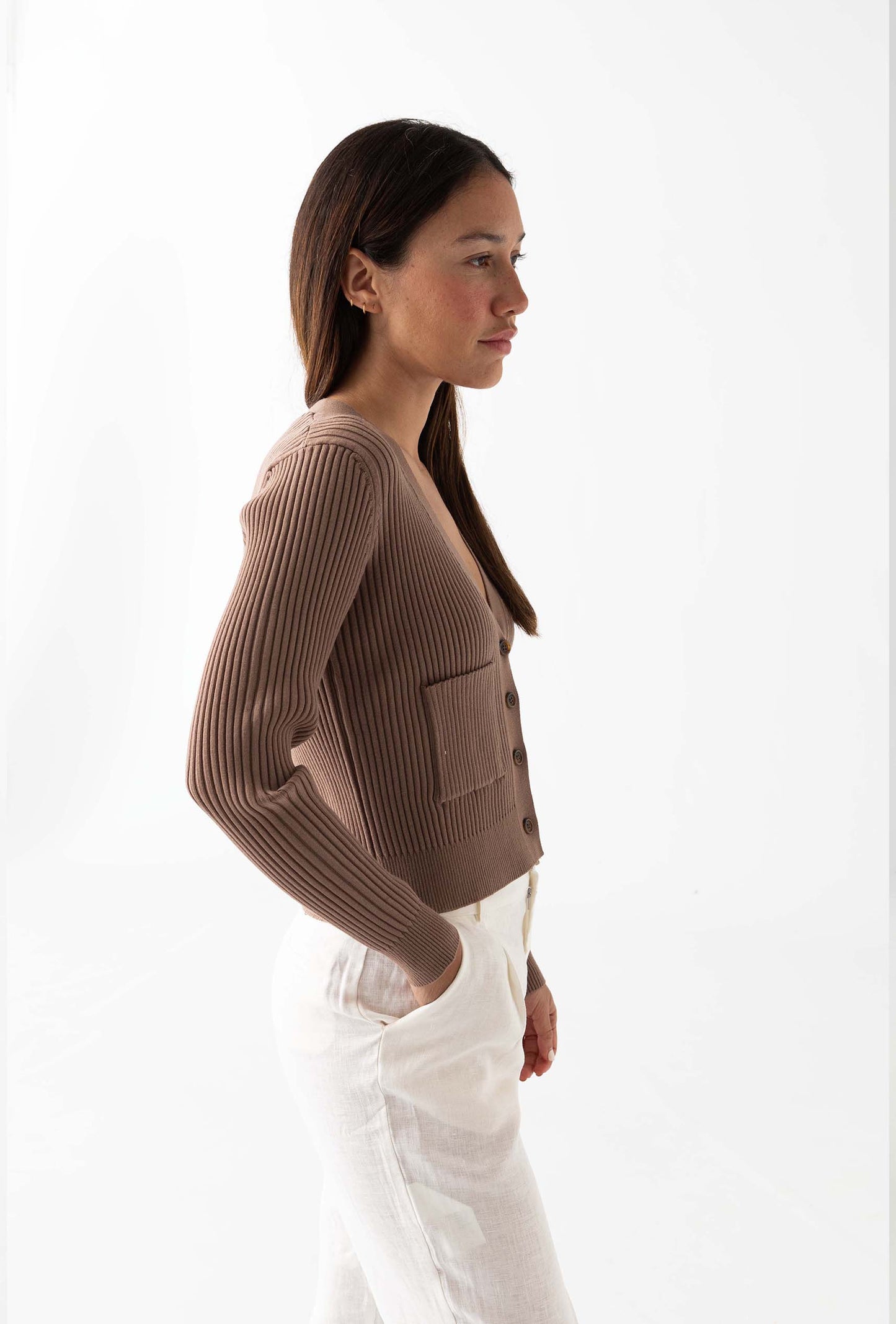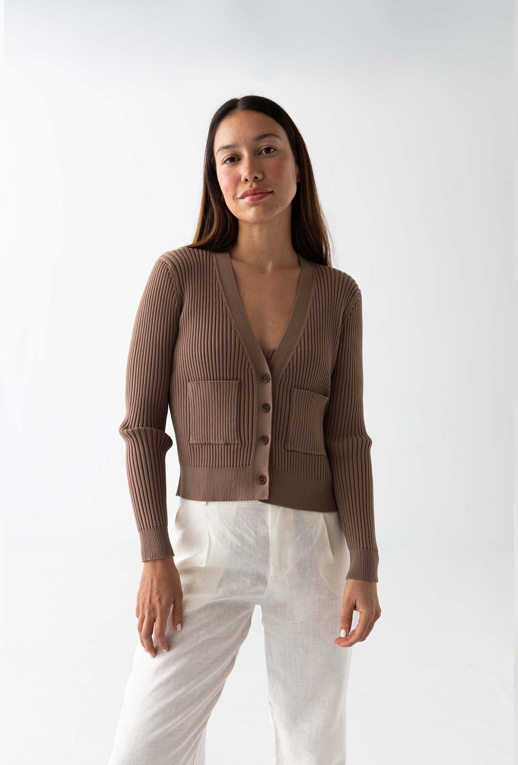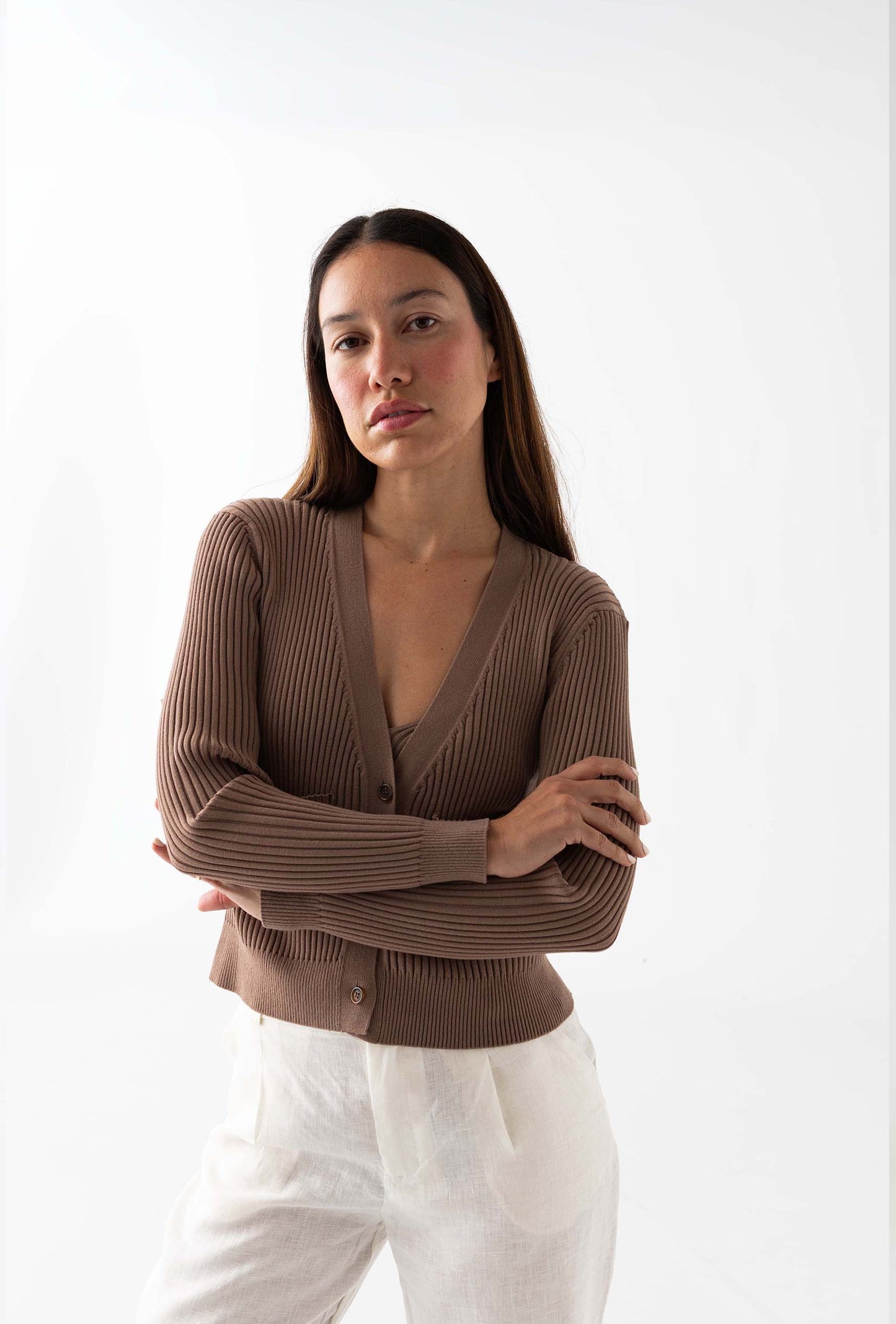 Le cardigan à manches longues présente une silhouette élégante et discrète. Coupe ajustée au buste et à la taille avec un décolleté en V flatteur. Ouverture devant avec fermeture boutonnée.