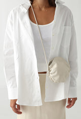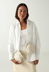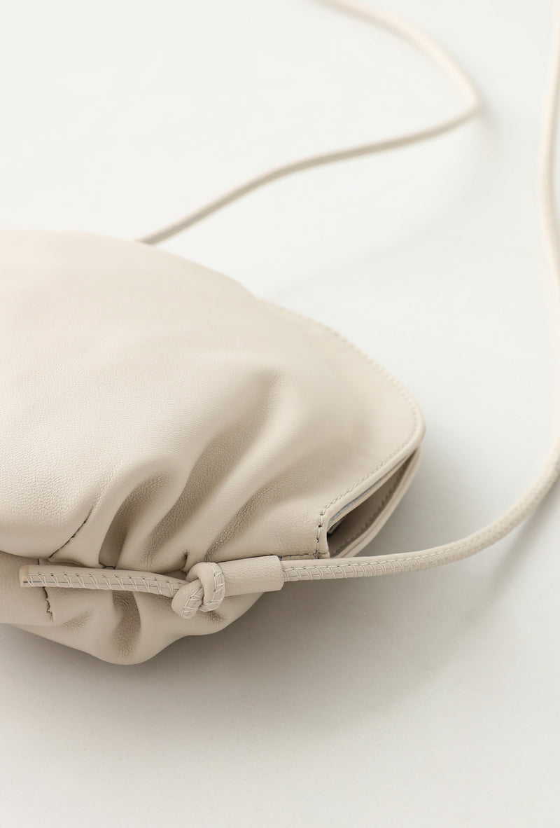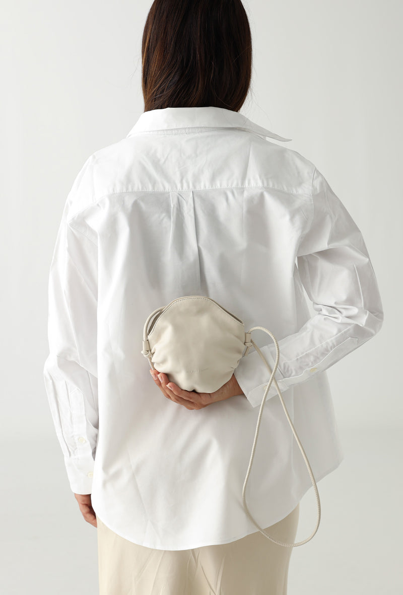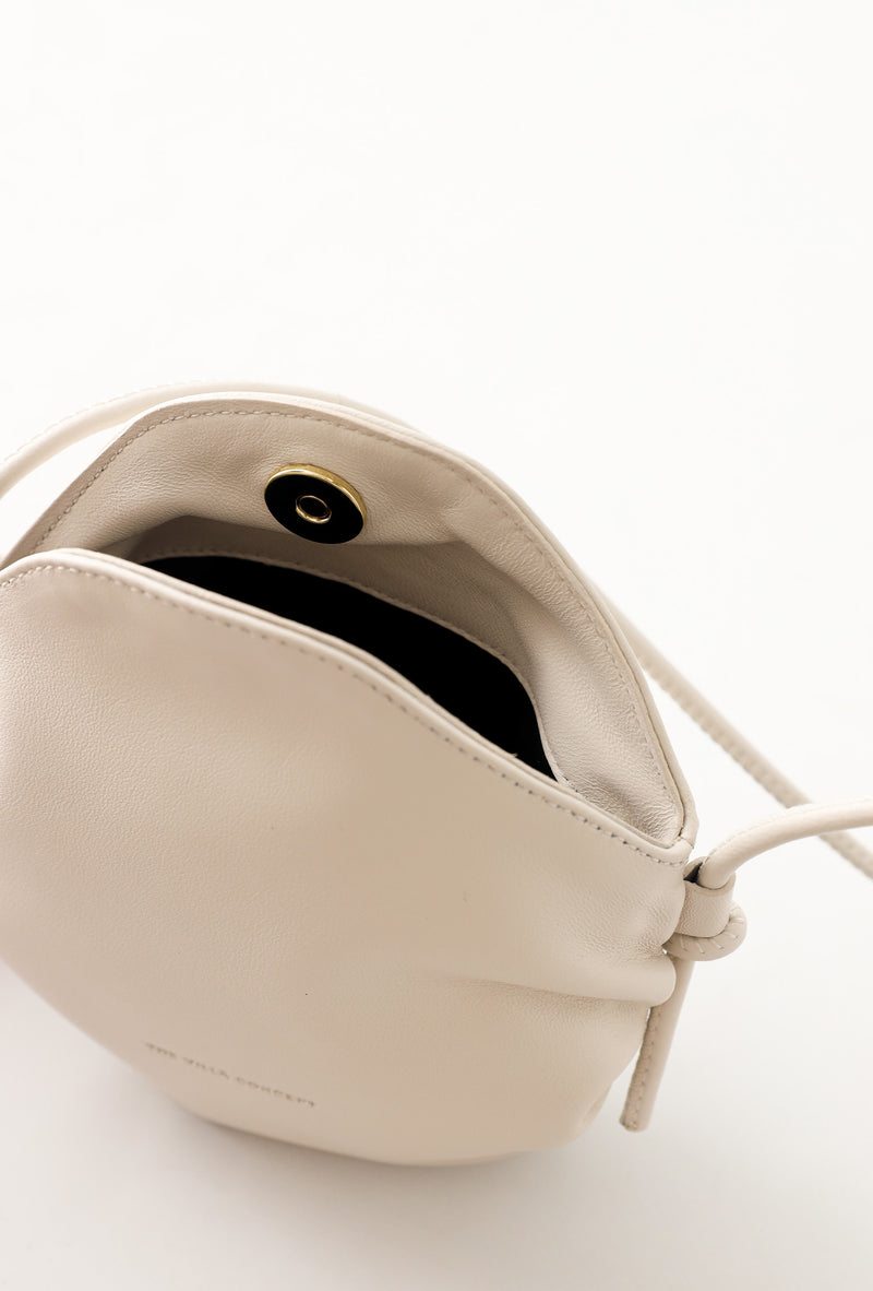 Shell Bag ha sido elaborado con 100% piel vacuna de textura suave de manera artesanal, y su forro interior es 100% algodón. Posee pliegues en la base del bolso que simula las formas orgánicas que dibujan la concha. Se puede llevar tanto cruzado como de hombro. En la parte delantera está grabado a fuego el característico logo de la marca.