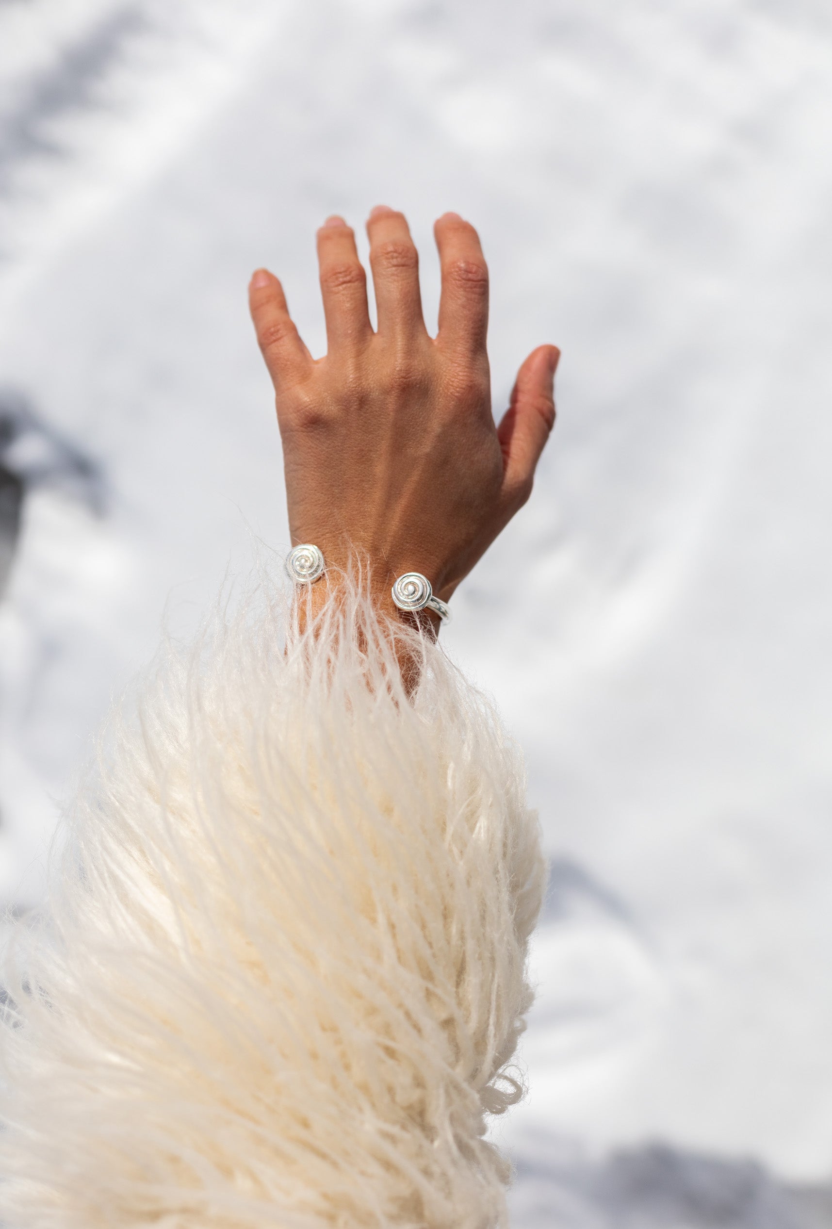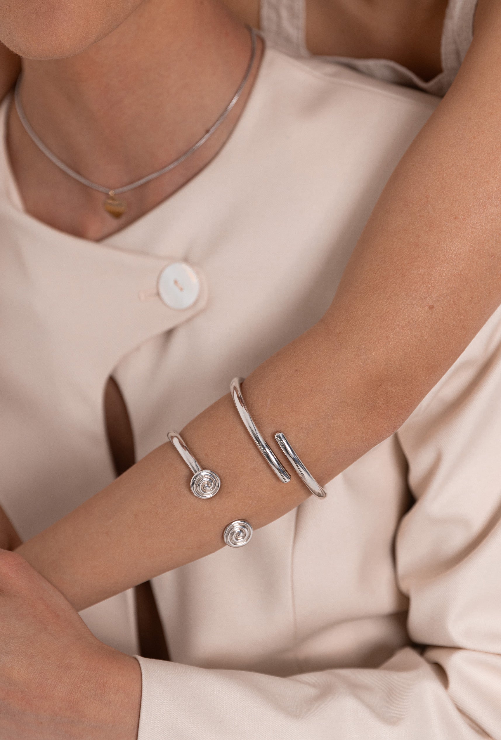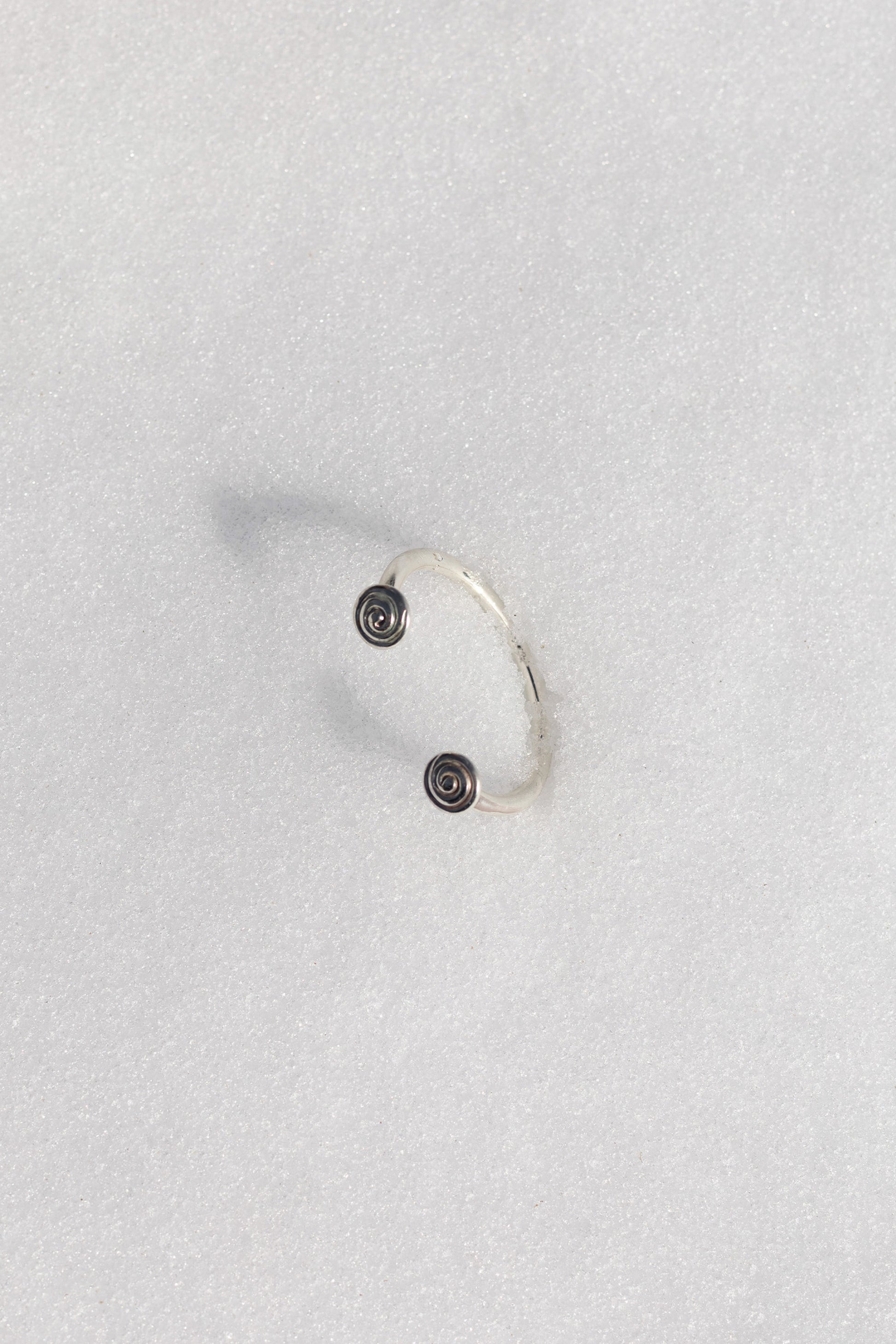 Este brazalete está fabricado con plata maciza de 1ª ley, su diseño estilizado destaca por su forma en espiral que se ajusta cómodamente a la muñeca y detalle de conchas en las extremidades.