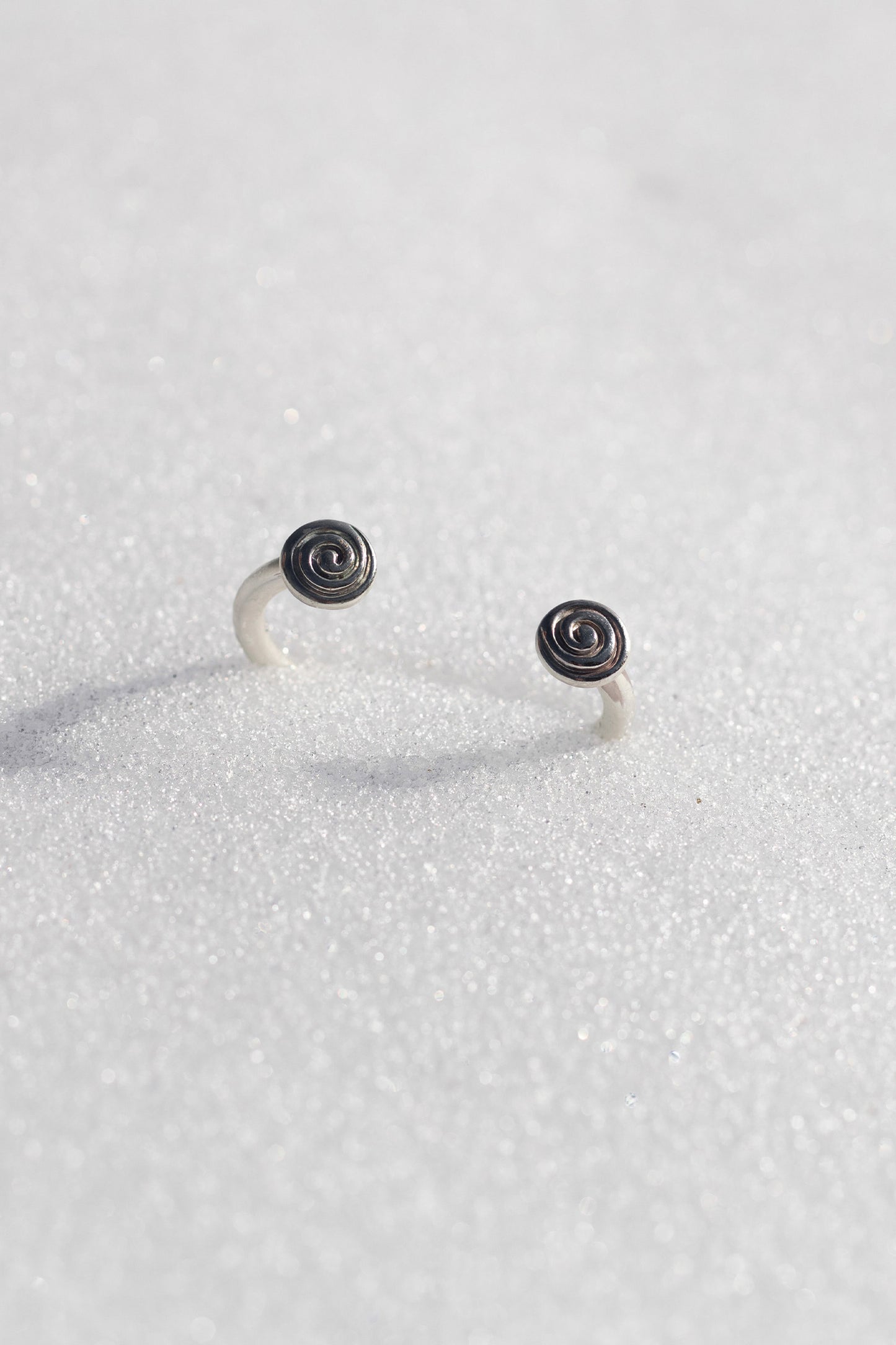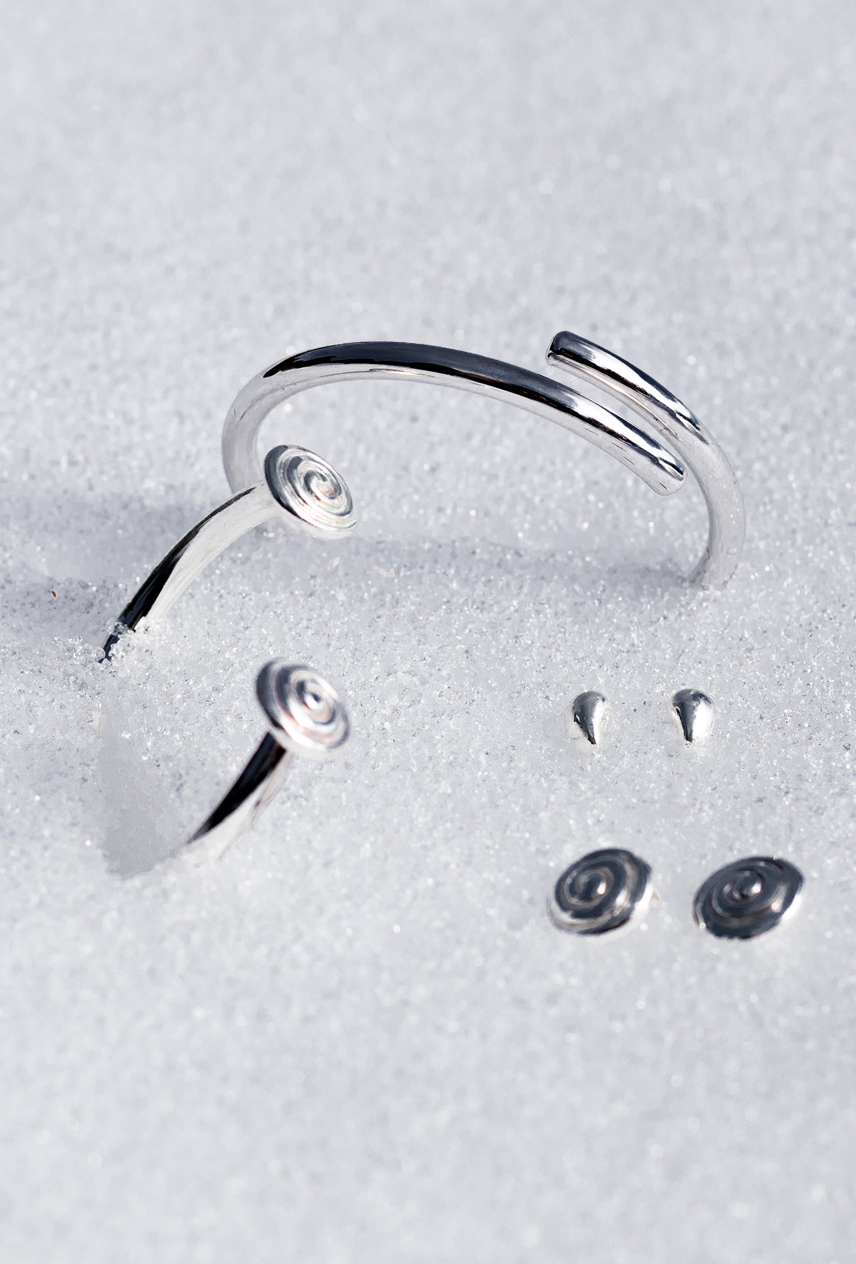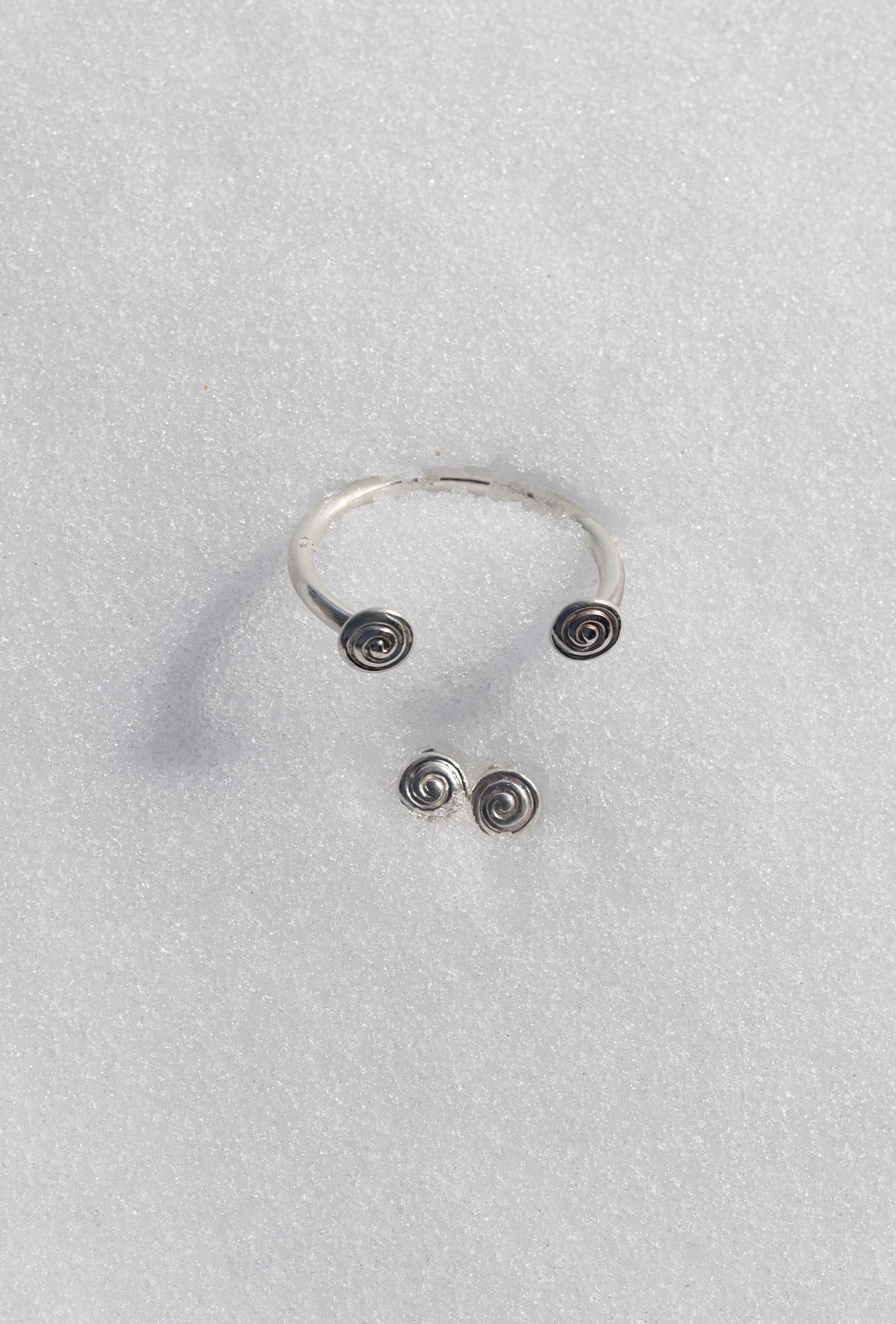 Este brazalete está fabricado con plata maciza de 1ª ley, su diseño estilizado destaca por su forma en espiral que se ajusta cómodamente a la muñeca y detalle de conchas en las extremidades.