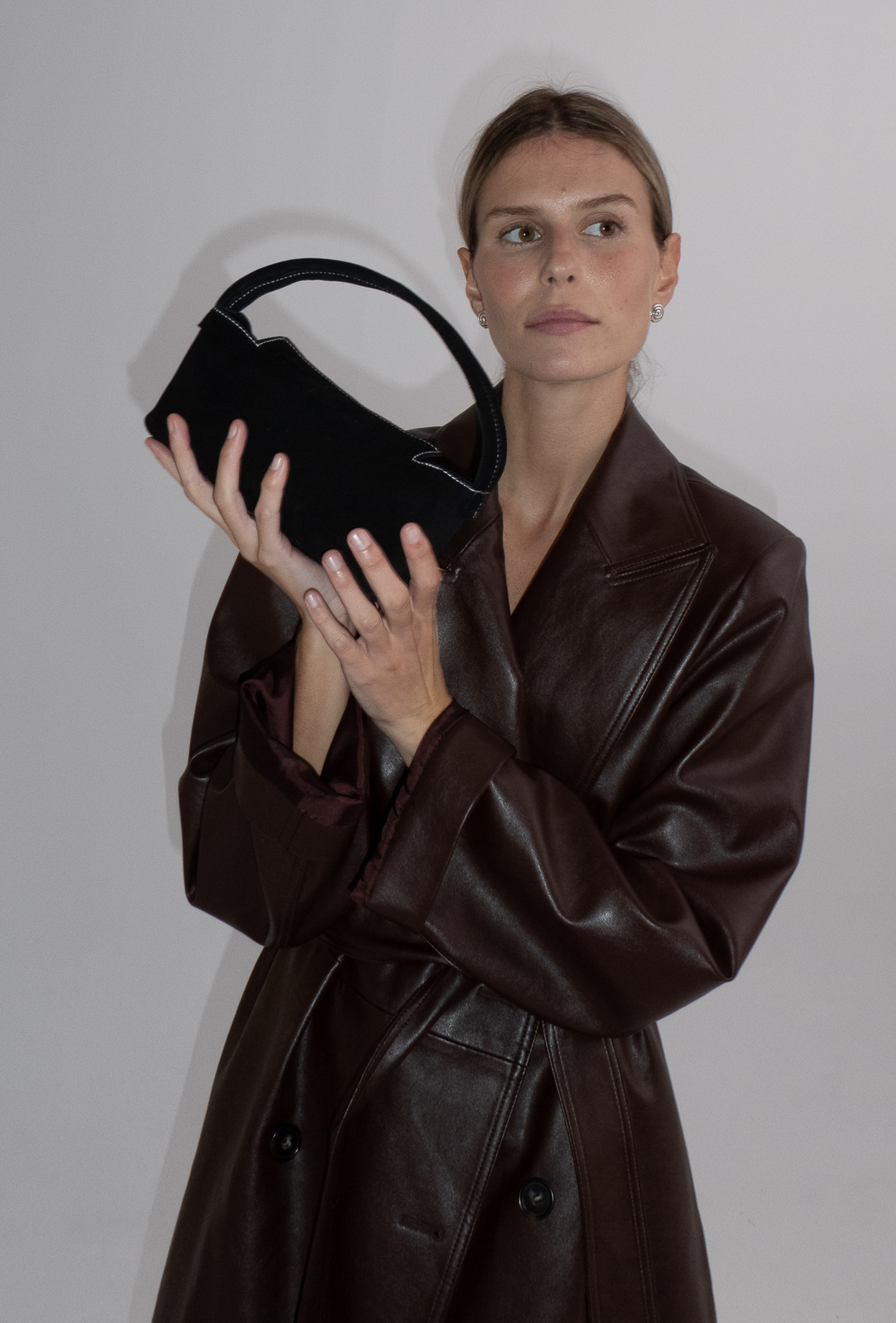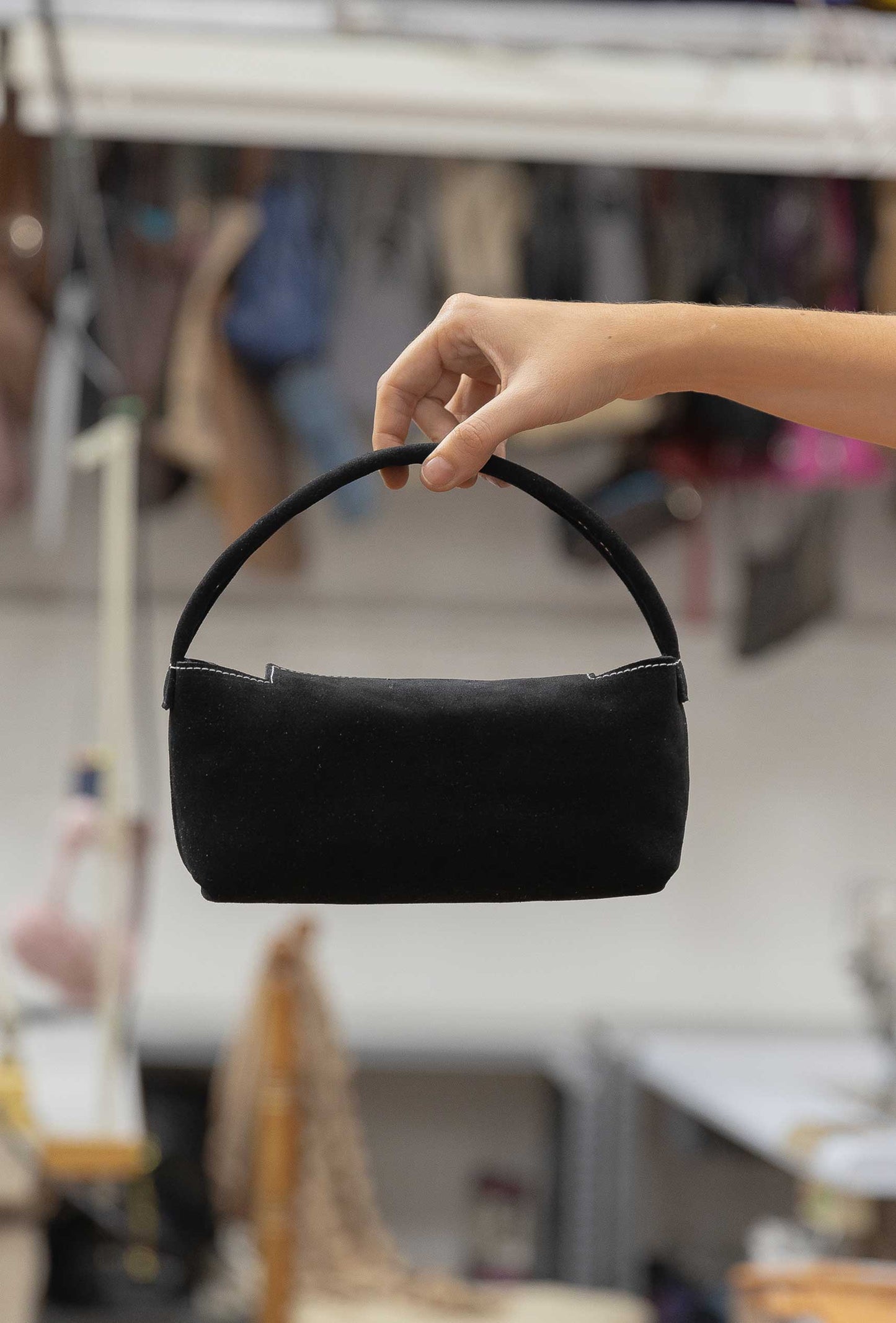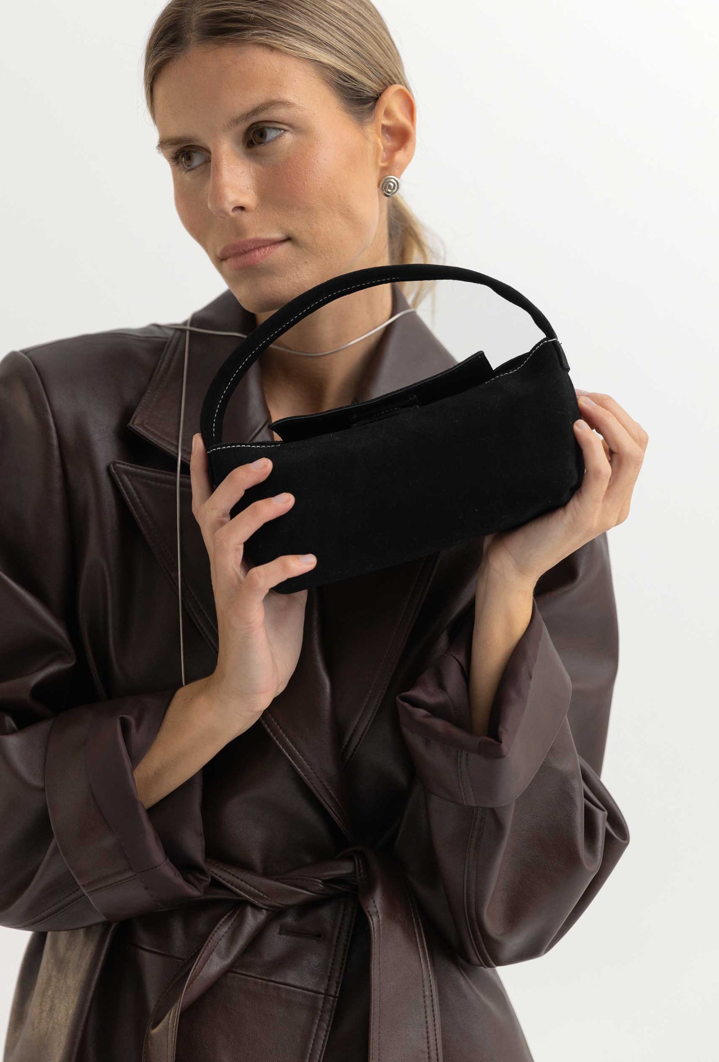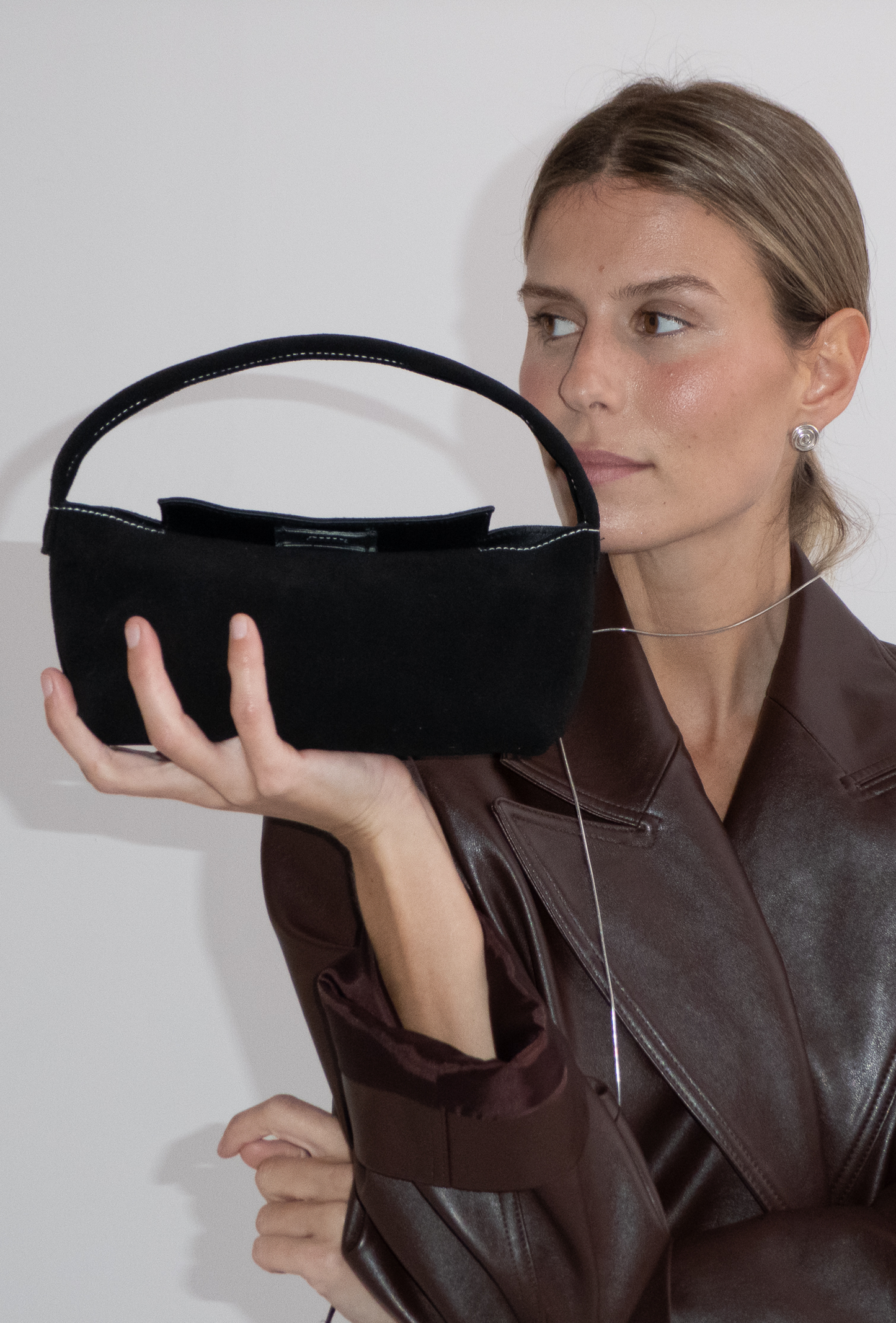 Bolso confeccionado con piel vacuna y acabado en serraje. Este bolso en tamaño mini color negro destaca por su remallado en color blanco.