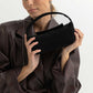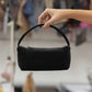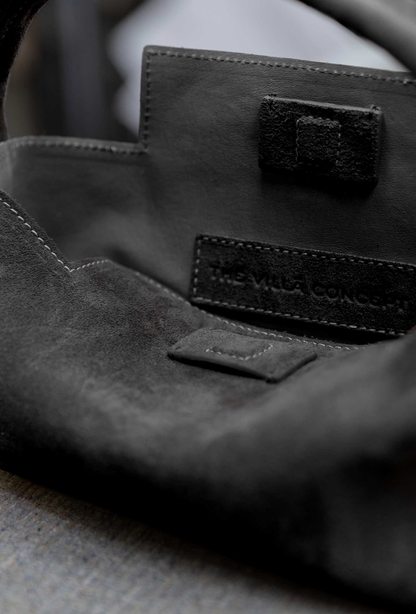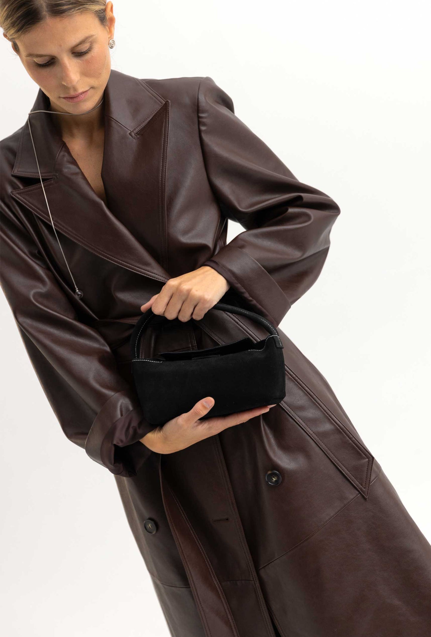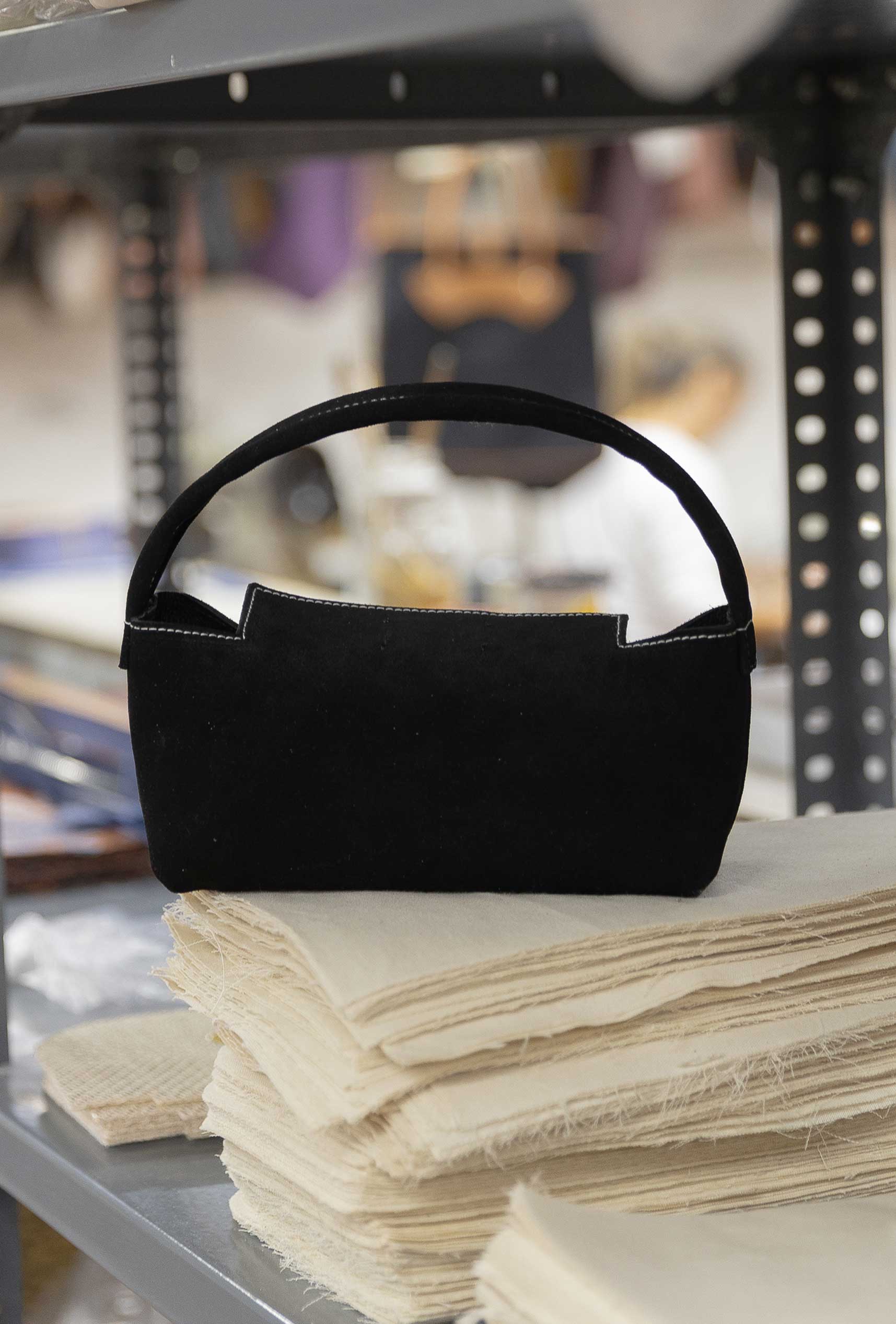 Bolso confeccionado con piel vacuna y acabado en serraje. Este bolso en tamaño mini color negro destaca por su remallado en color blanco.