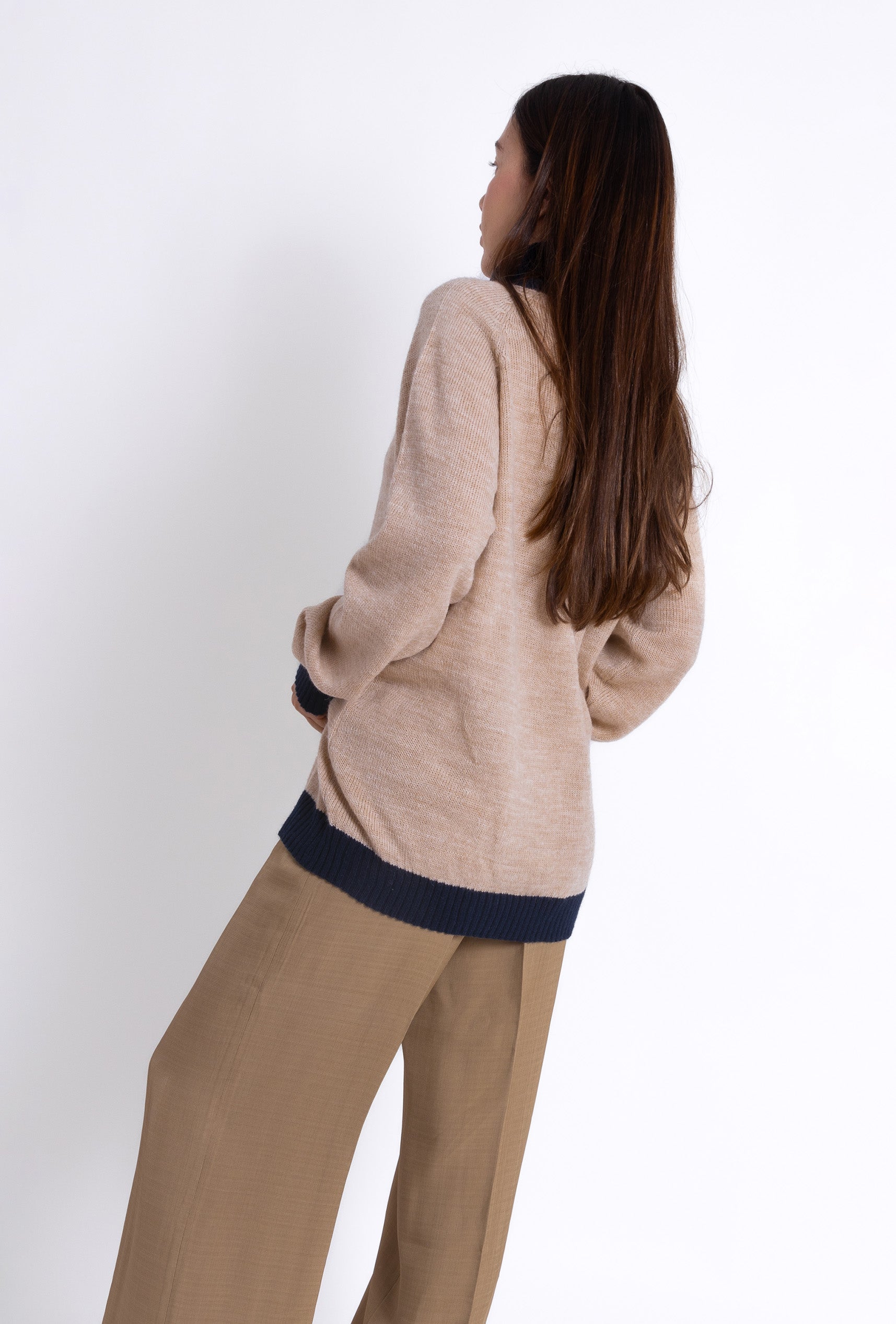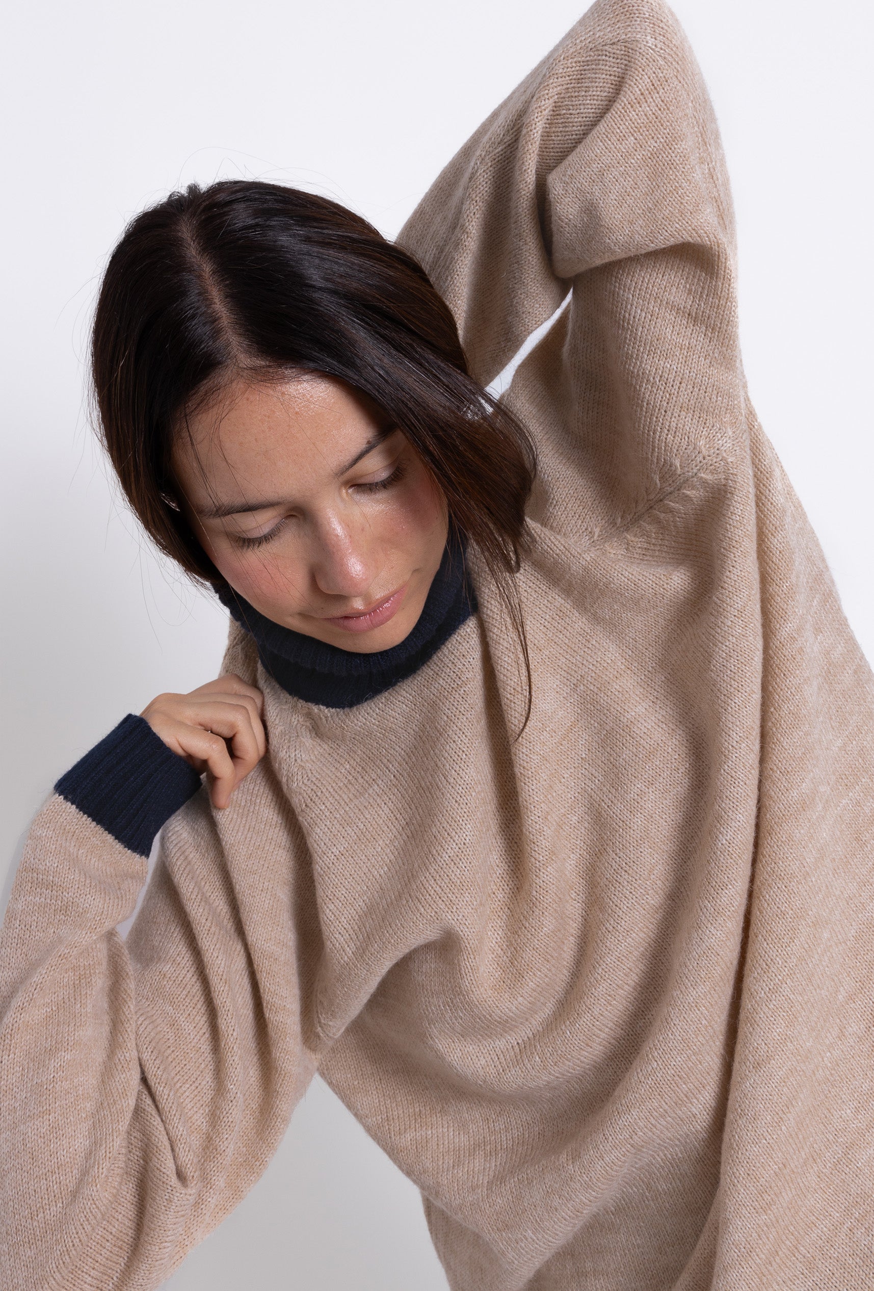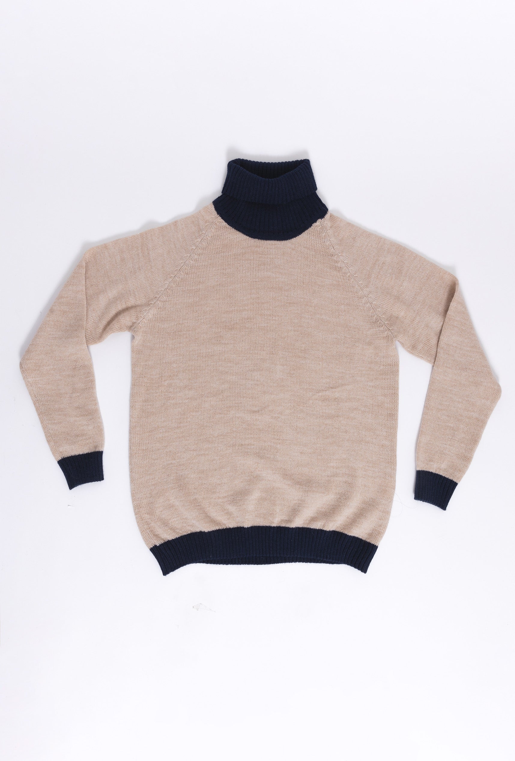 Nuestro jersey Turtle Neck Sweater es una prenda de alta calidad tejida en 100% Alpaca de forma artesanal. Su suave tejido combina calidez y comodidad. Destaca por su diseño bicolor: un cuerpo en tono camel, complementando un cuello vuelto y puños en color navy. También disponible en off white & camel.