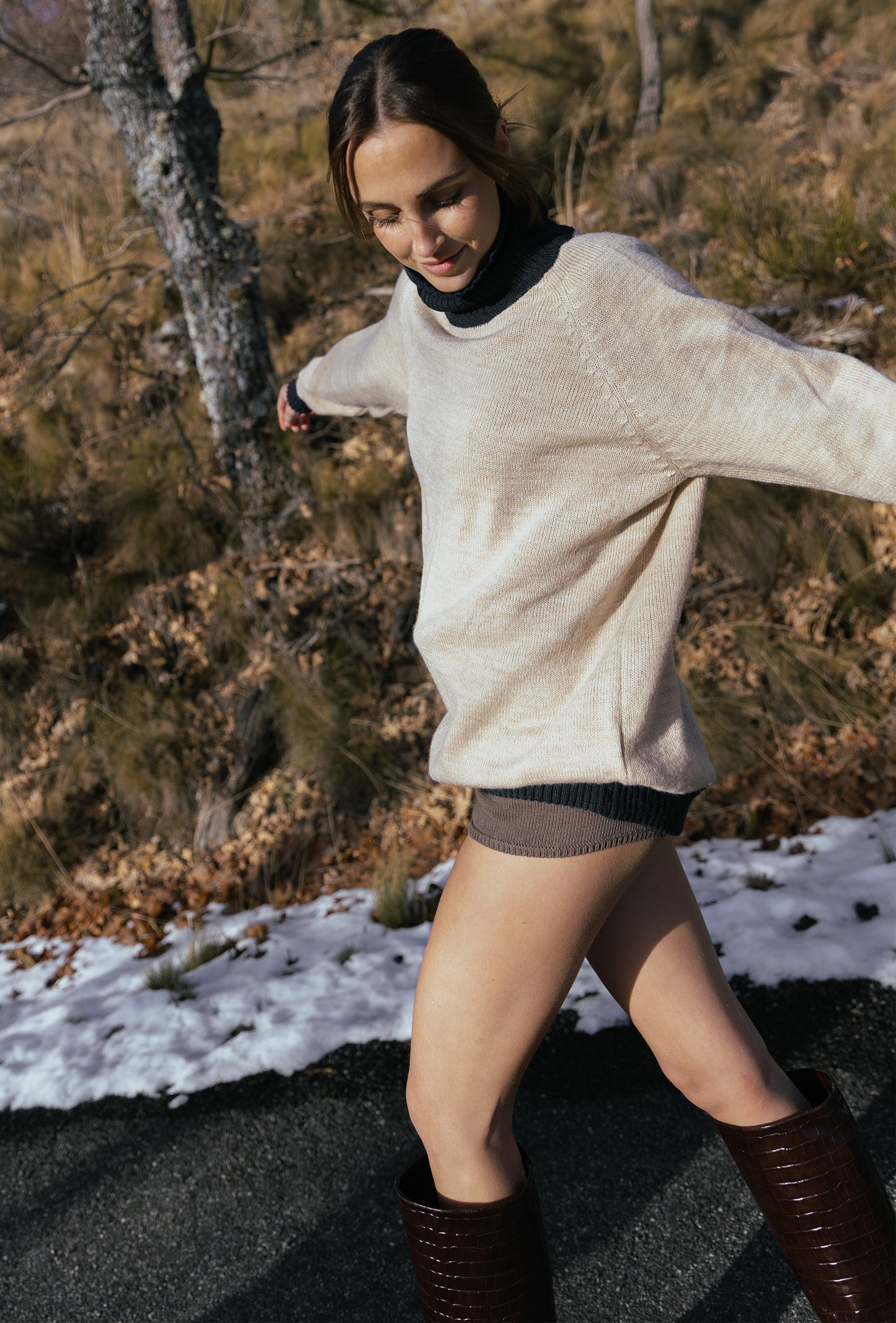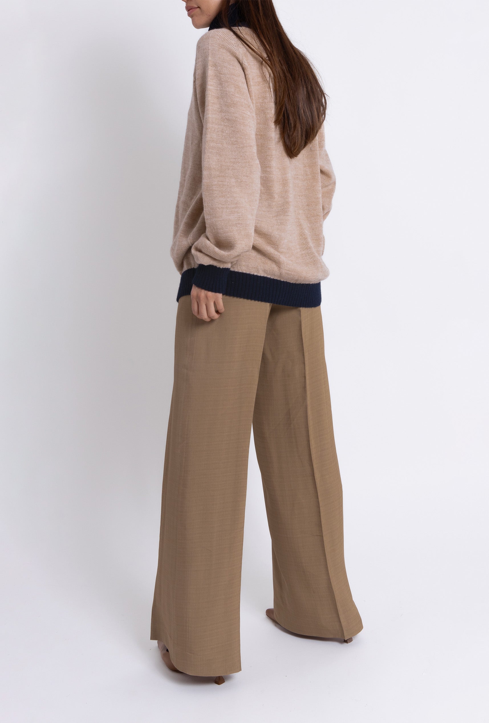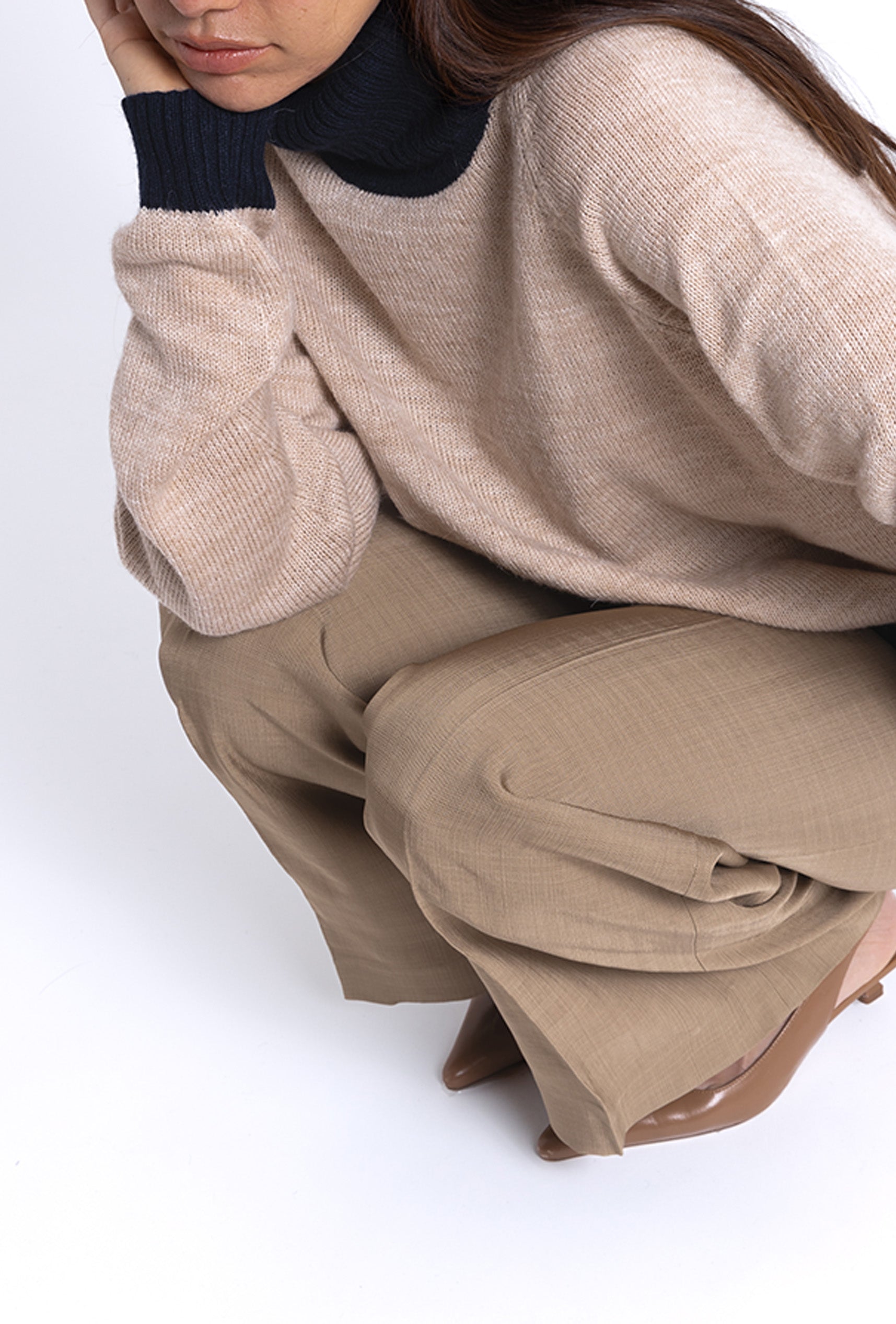 Nuestro jersey Turtle Neck Sweater es una prenda de alta calidad tejida en 100% Alpaca de forma artesanal. Su suave tejido combina calidez y comodidad. Destaca por su diseño bicolor: un cuerpo en tono camel, complementando un cuello vuelto y puños en color navy. También disponible en off white & camel.