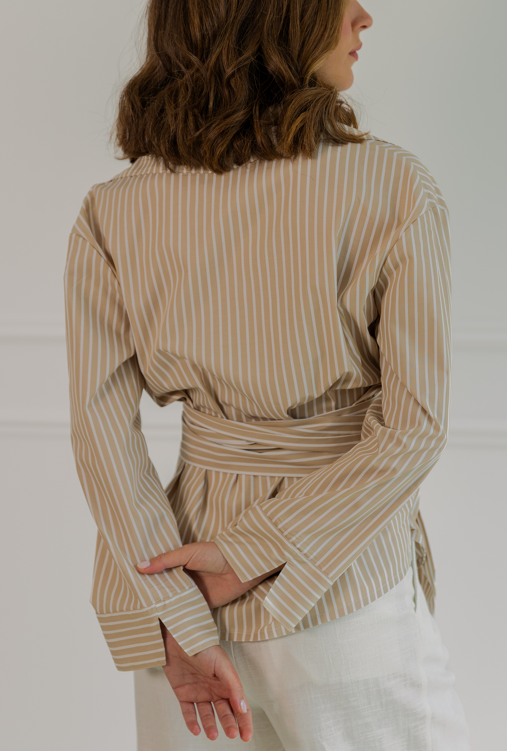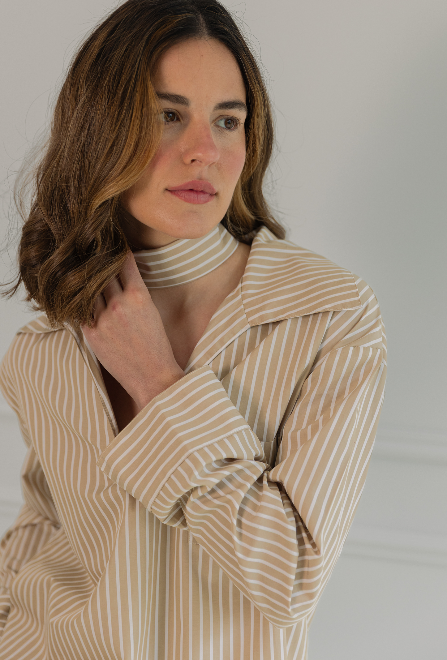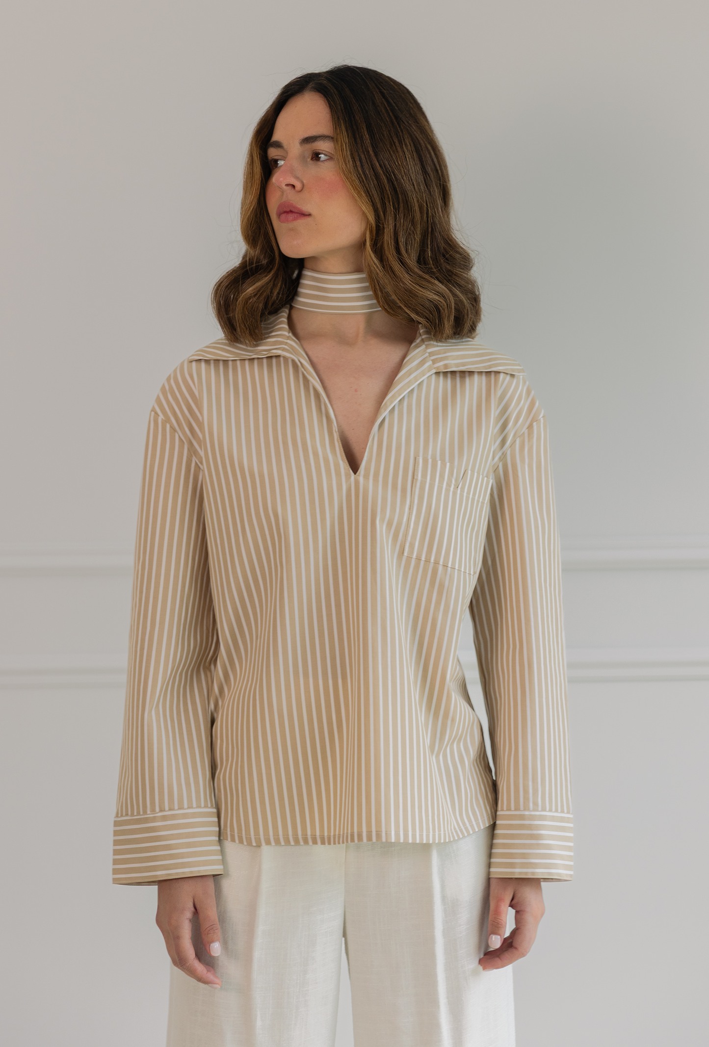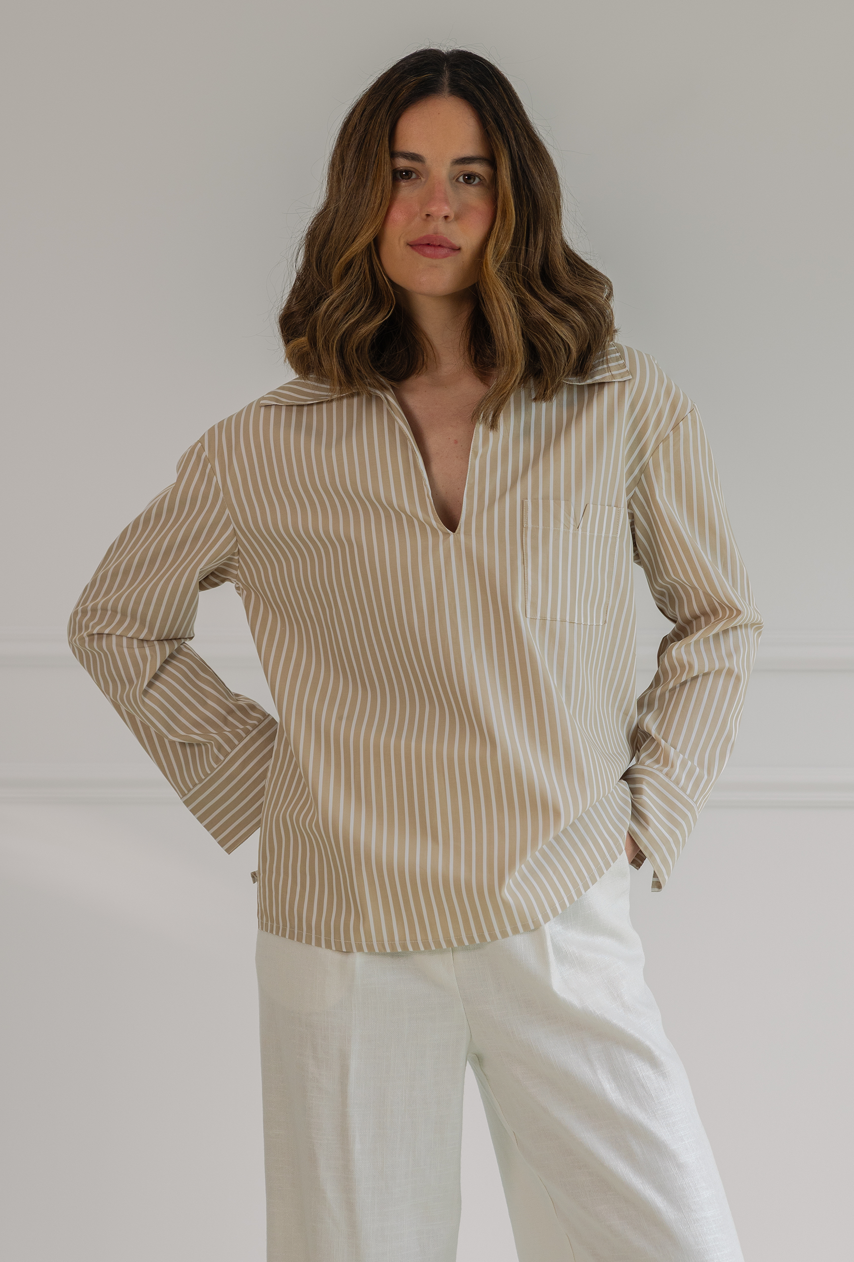 Camisa de rayas blanca y camel confeccionada en 100% algodón. Su escote en pico alarga visualmente el cuello y  aporta un aire despreocupado, mientras que el bolsillo en el pecho —con forma de “V”, nuestro sello distintivo— añade carácter y funcionalidad.