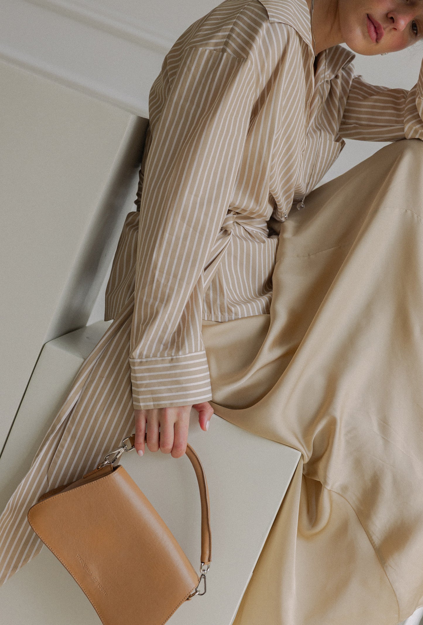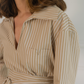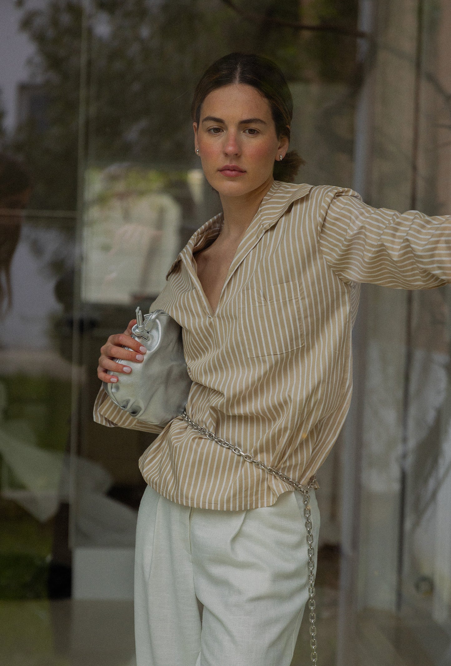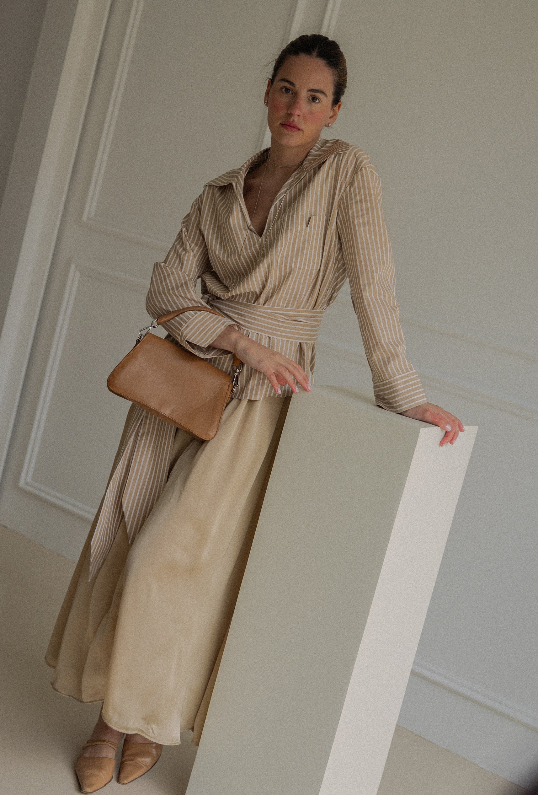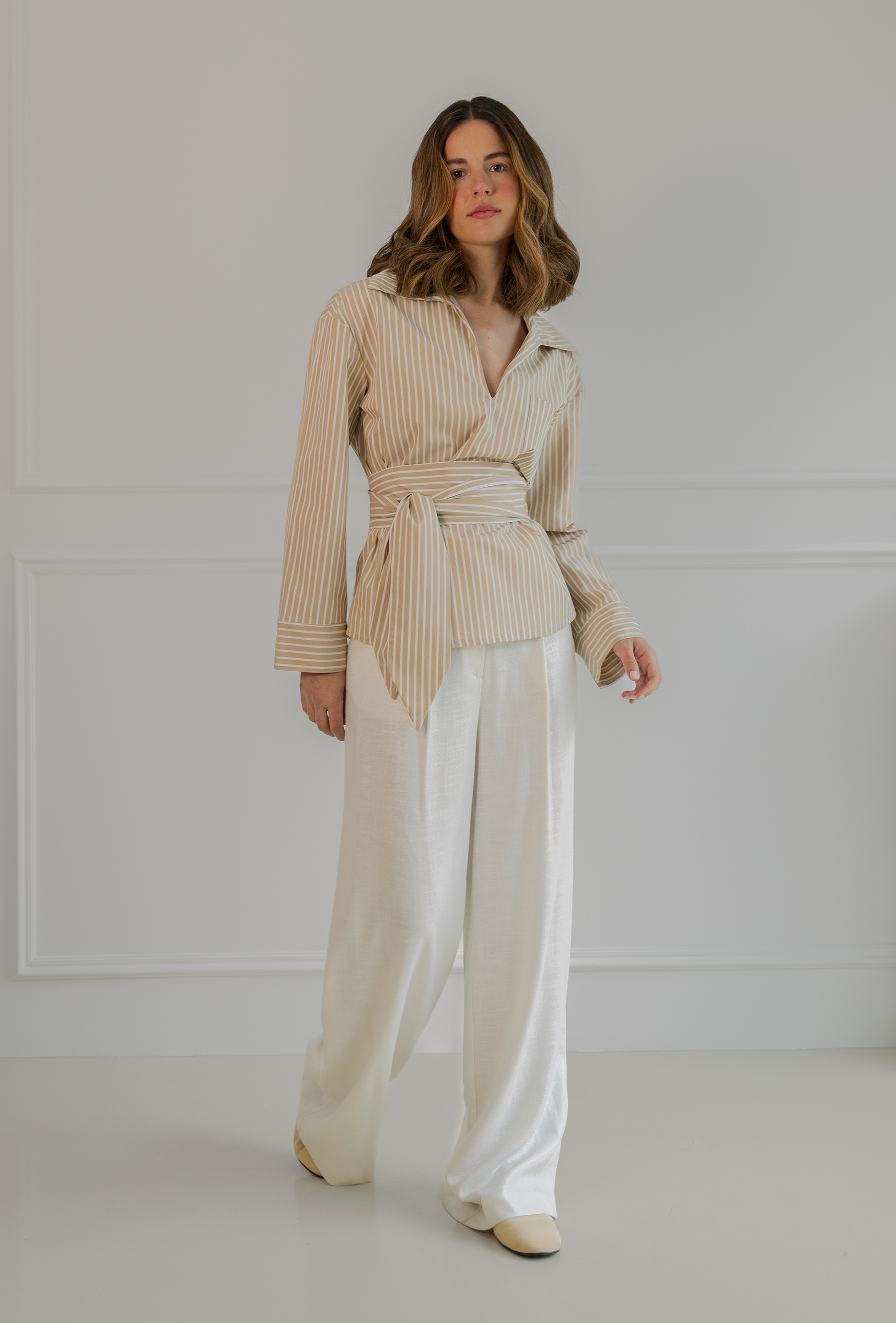 Camisa de rayas blanca y camel confeccionada en 100% algodón. Su escote en pico alarga visualmente el cuello y  aporta un aire despreocupado, mientras que el bolsillo en el pecho —con forma de “V”, nuestro sello distintivo— añade carácter y funcionalidad.